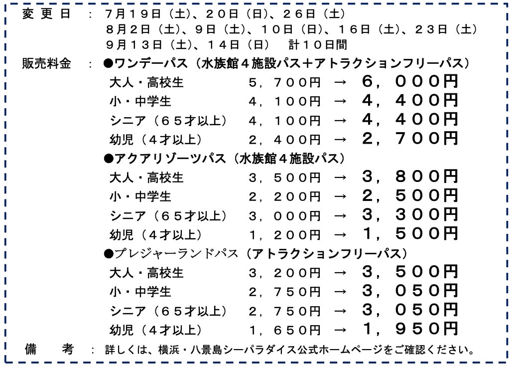 『横浜・八景島シーパラダイス』では、2025年7月19日(土)~9月14日(日)内の特定日において、各種チケット料金を変更させていただきます。