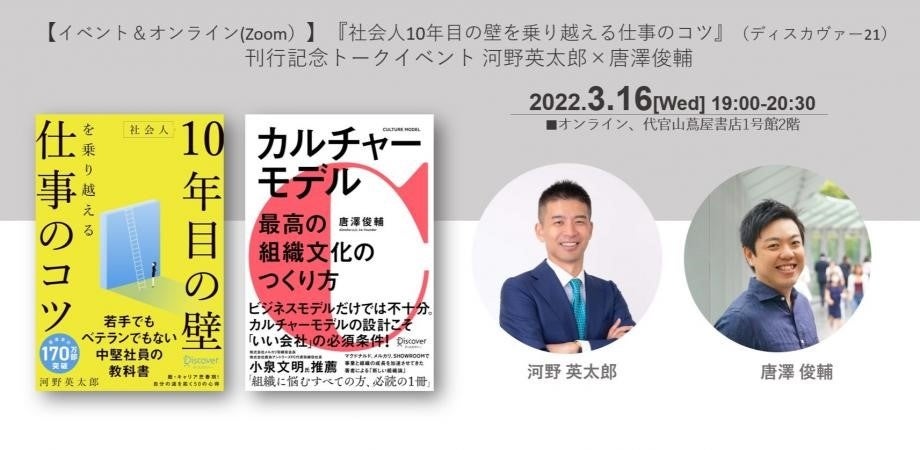 株式会社ディスカヴァー・トゥエンティワン(本社:東京都千代田区、取締役社長:谷口奈緒美)は2022年3月16日に『社会人10年目の壁を乗り越える仕事のコツ』(河野英太郎・著)の刊行を記念して、著者の河野英太郎さんと唐澤俊輔さんとの対談イベントを、代官山蔦屋書店にて、オフライン・オンライン同時開催します。