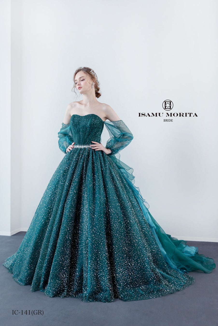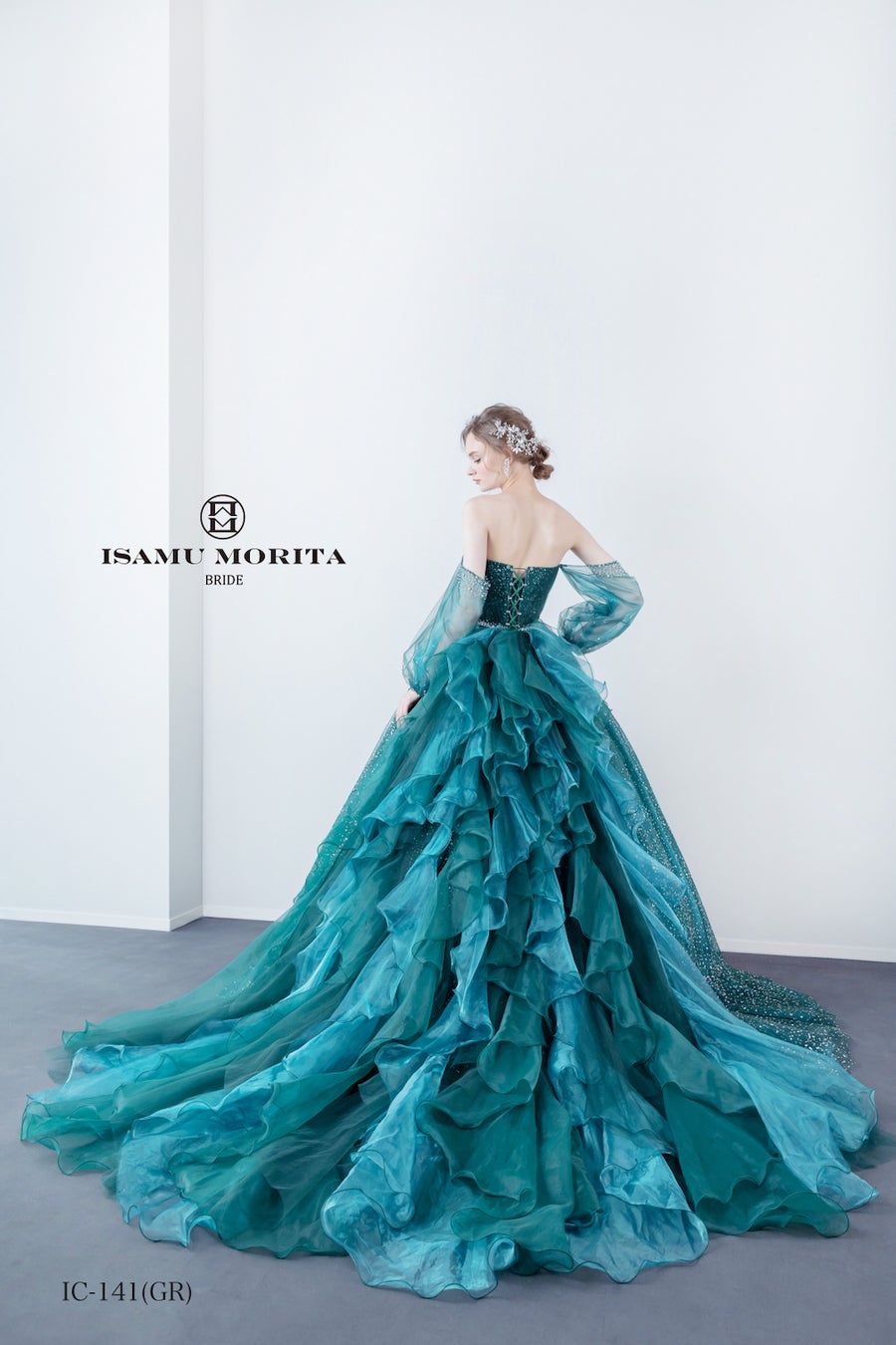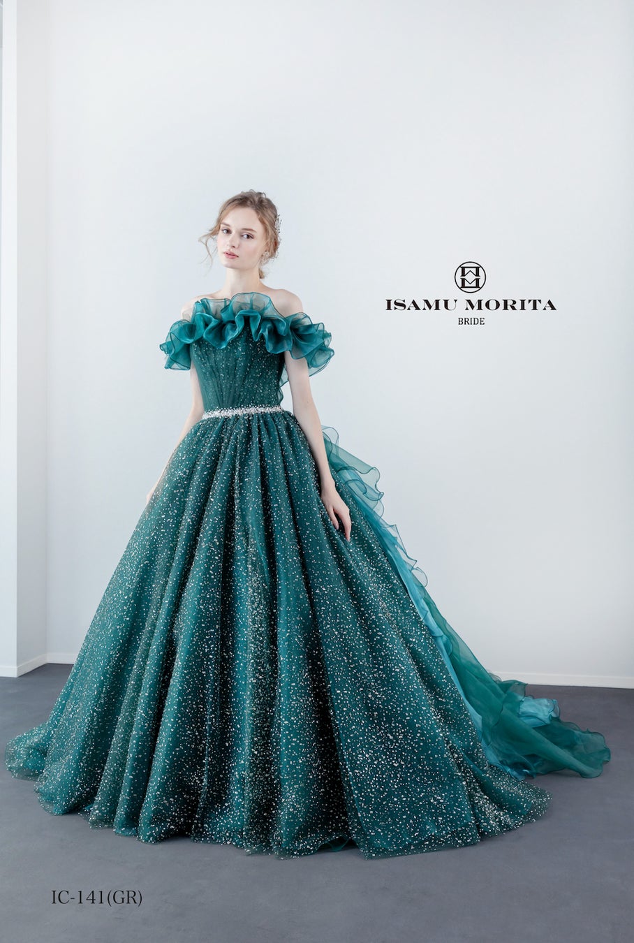 大粒のグリッターをドレス全体に散りばめて眩い光を表現した、プレミアムなカラードレス。取り外し可能な、ソフトパフスリーブやラッフルショルダー、伸びやかなラッフルバックトレーンなどのさまざまなシーンに合わせた着こなしが可能です。