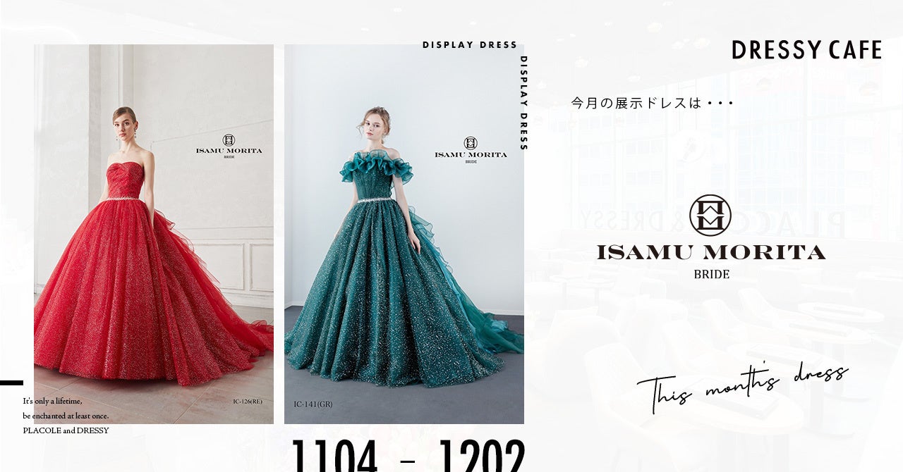 【DRESSY CAFE NAGOYA】11月のディスプレイドレスは「ISAMU MORITA BRIDE」のウェディングドレスを期間限定でお届けいたします。