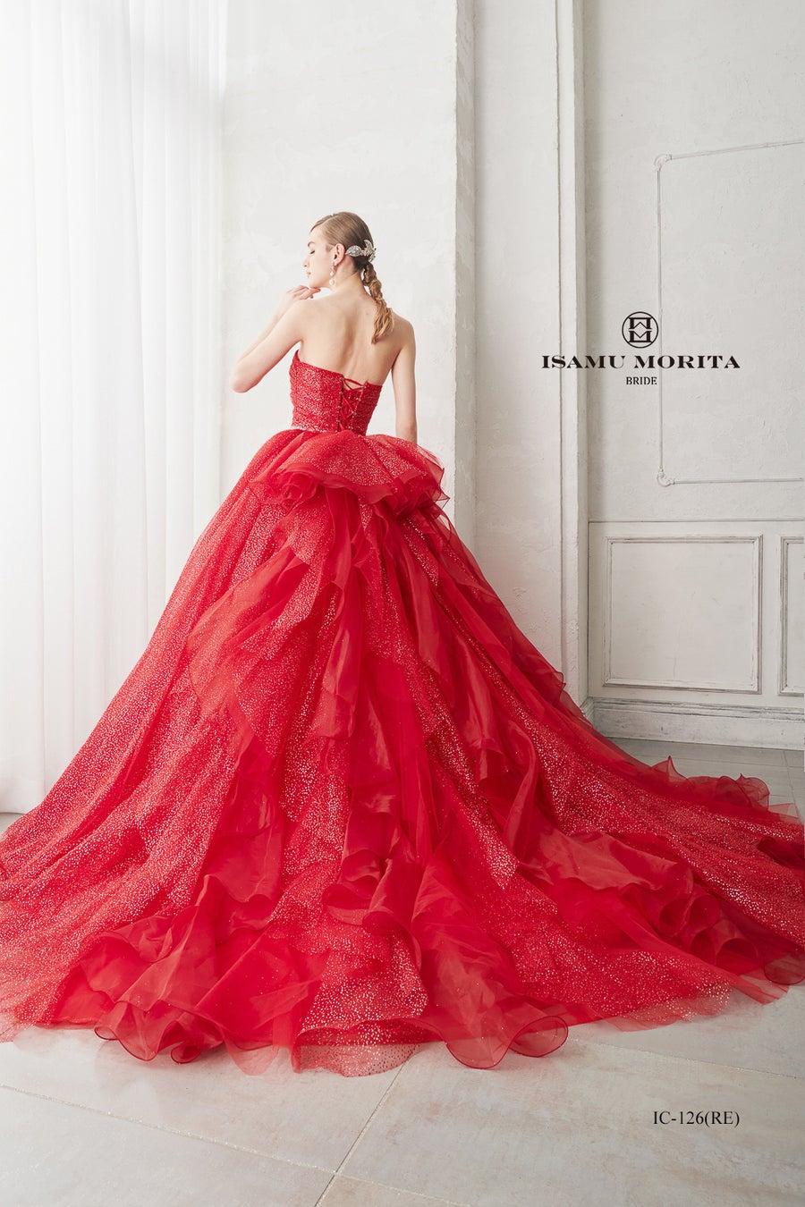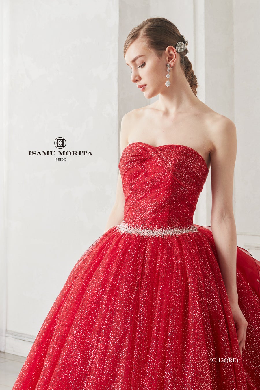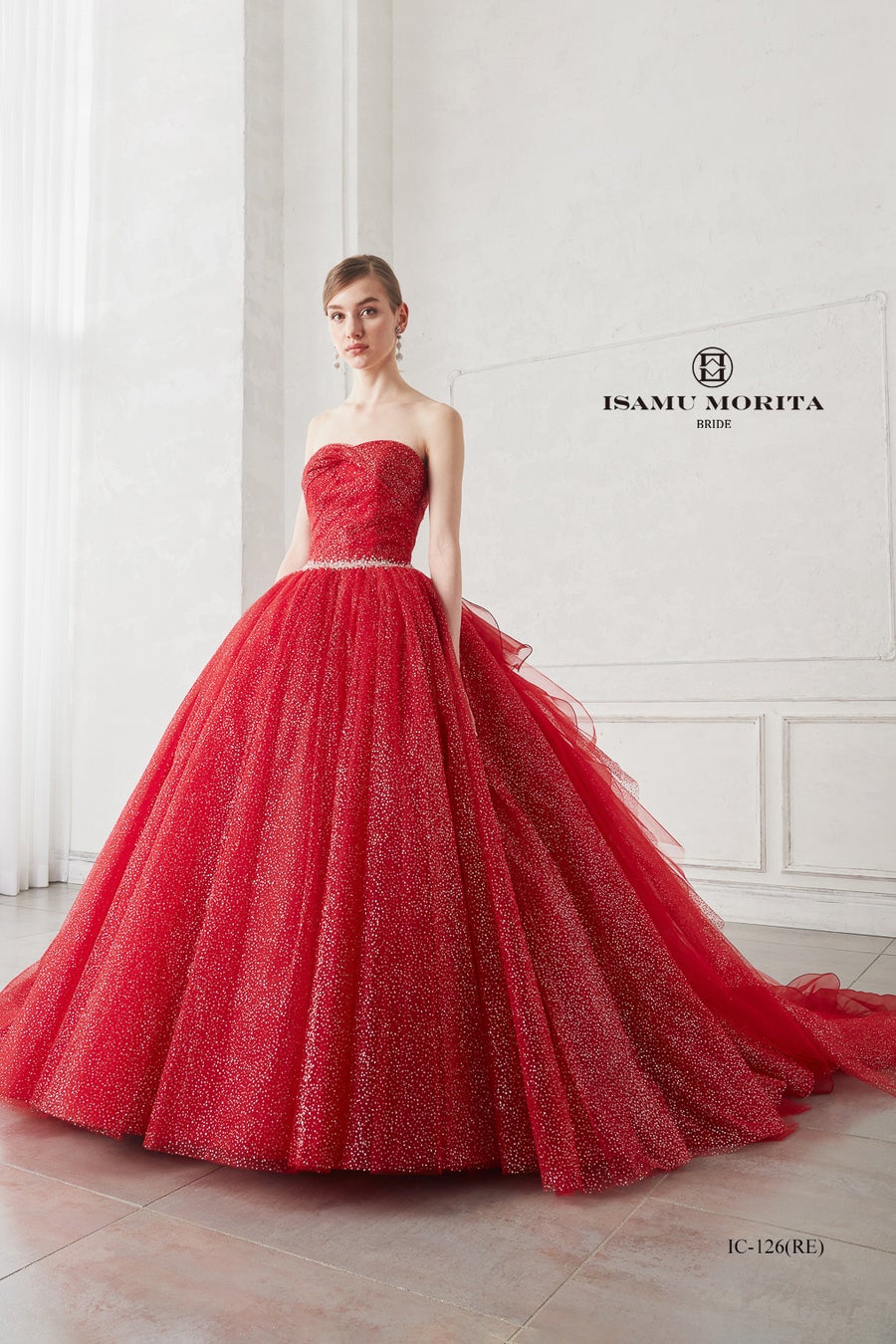 繊細な3種類のグリッターを混ぜ合わせた、印象的な輝きが魅力的な オリジナル素材を全体的に使用したプレミアムな1着。 ウエストのハンドメイドのビジュー、身頃をスタイルアップに包み込むパターン技術、深みのある赤色を、幾重にも重ね合わせたチュール素材で表現し 特別な1着に仕上げました。