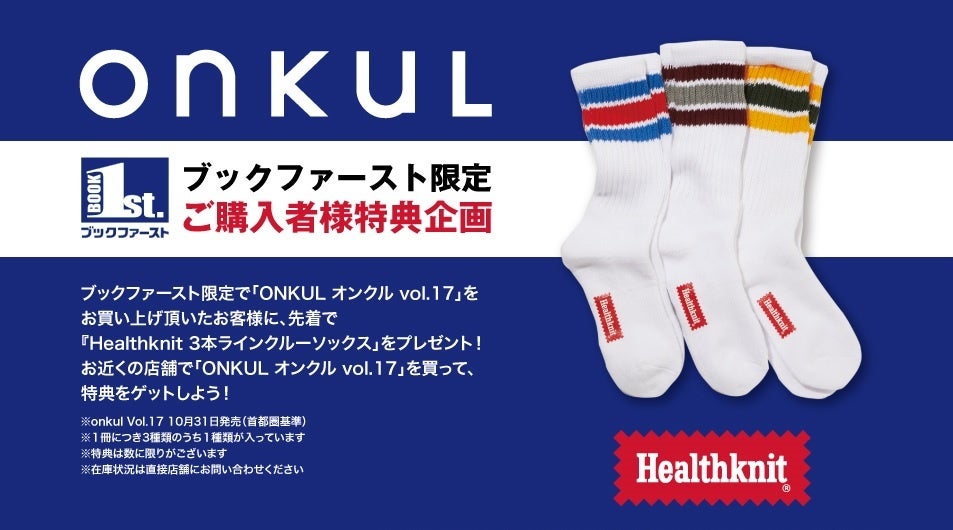全国のブックファーストにて「ONKUL vol.17」をご購入のお客様に、先着で「Healthknit 3本ラインクルーソックス」をプレゼント!