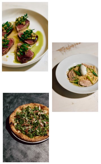鰹出汁を加えた梅のドレッシングをベースに梅と相性抜群の鰯をシンプルなマリネにし、モッツァレラや九条葱と一緒に焼き上げます。仕上げのルッコラと茗荷のサラダでさっぱりとお召し上りください。