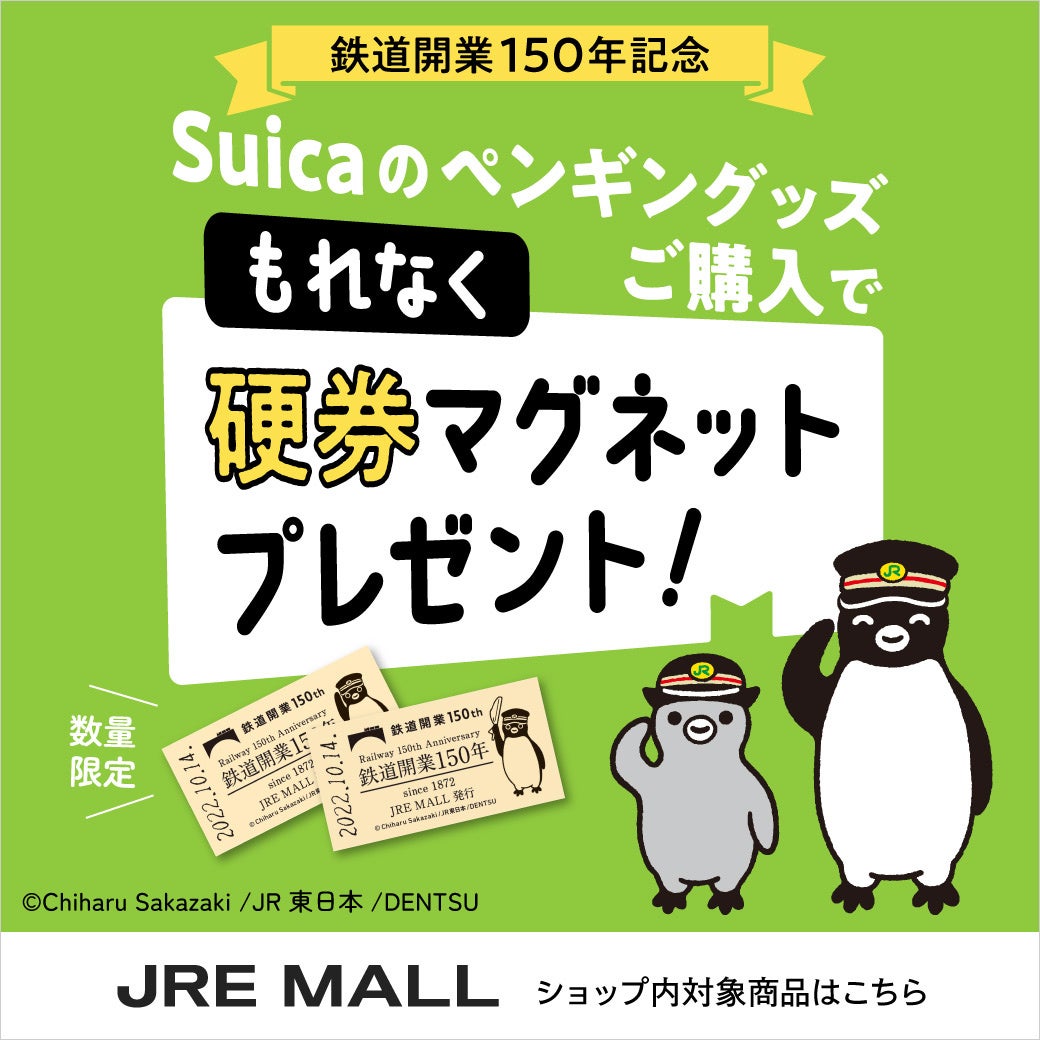 JR東日本は、鉄道開業150年を記念して「JRE MALL」で対象のSuicaのペンギングッズを購入すると、駅員さんに扮したSuicaのペンギンをあしらった硬券きっぷ型のマグネットをプレゼントするキャンペーンを実施中です。