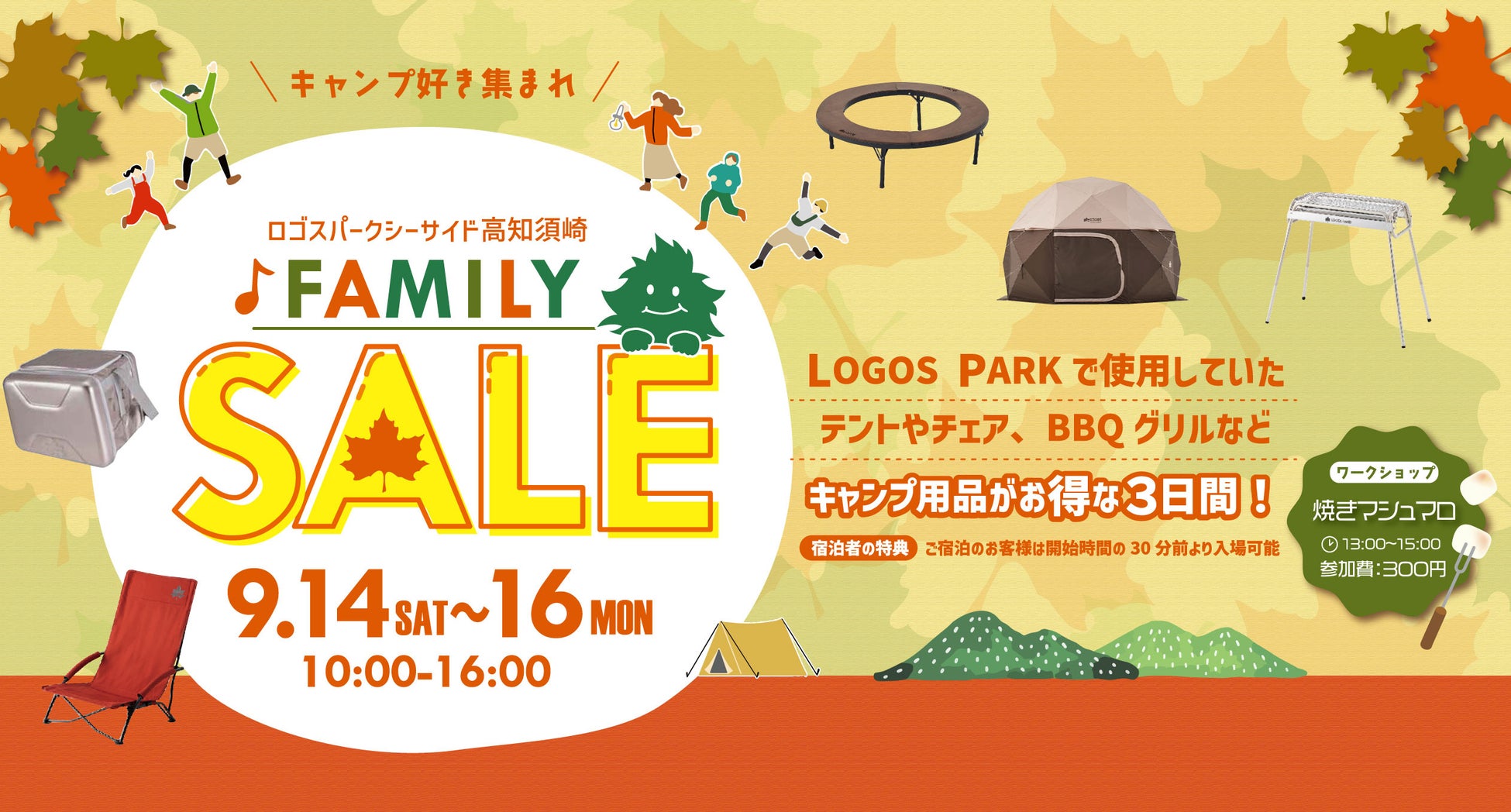 本イベントは、ロゴスパークシーサイド高知須崎にて、テントやチェアなどキャンプ用品をお得にお買い求めいただける3日間限定の「FAMILY SALE」です。