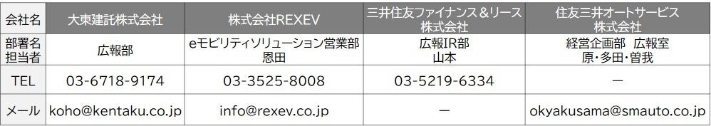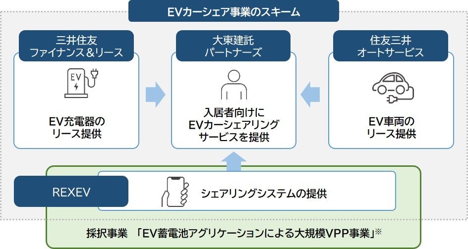 大東建託グループの大東建託パートナーズ株式会社(本社:東京都港区、代表取締役社長:佐藤功次、以下、大東建託パートナーズ)は、2023年3月より、株式会社REXEV(本社:東京都千代田区、代表取締役社長:渡部健、以下、REXEV)、三井住友ファイナンス&リース株式会社(本社:東京都千代田区、代表取締役社長:橘正喜、以下、三井住友ファイナンス&リース)、住友三井オートサービス株式会社(本社:東京都新宿区、代表取締役社長:佐藤計、以下、住友三井オートサービス)と共同で、大東建託パートナーズが管理する賃貸住宅の入居者を対象に、同社の社有車を活用した「電気自動車(以下、EV)カーシェア」の事業化に向けた取り組みを開始します。