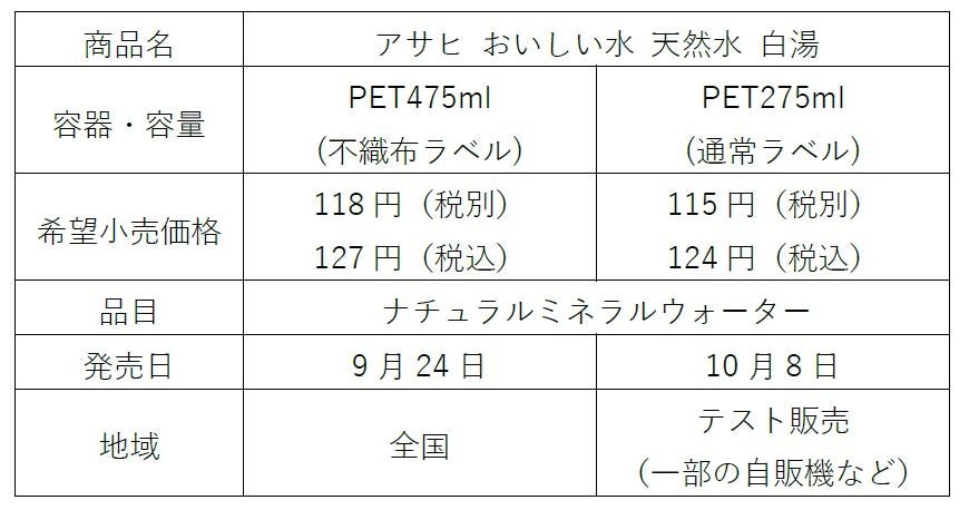 アサヒ飲料株式会社(本社 東京、社長 米女太一)は、『アサヒ おいしい水 天然水 白湯』を従来の340mlから475mlに増量して9月24日から発売します。10月8日からは、出勤時や外出先で手軽に購入したいという需要に合わせ、一部の自動販売機などでPET275mlのテスト販売を開始します。