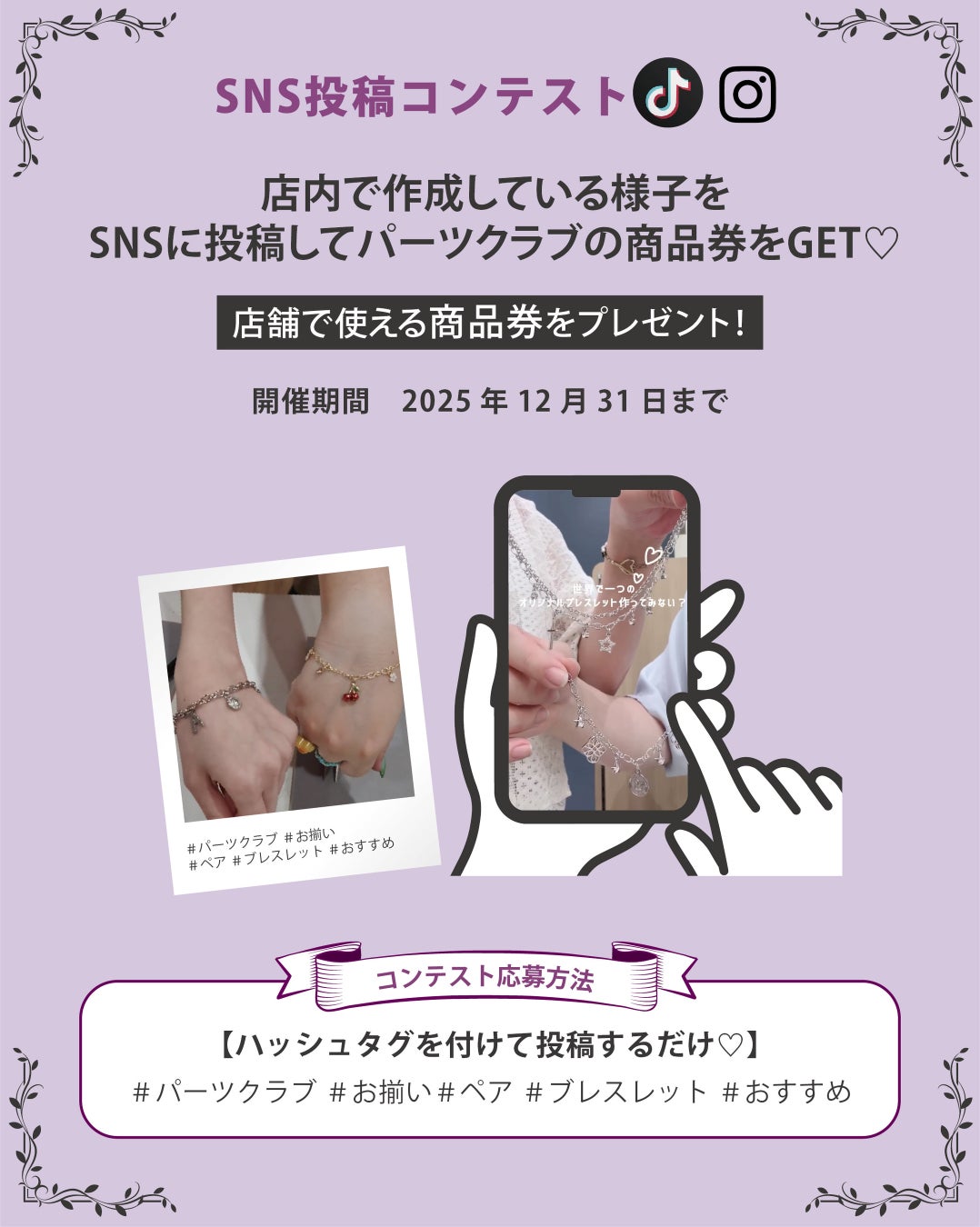 店内でアクセサリーを制作している様子をSNSに投稿すると、抽選でパーツクラブの商品券をプレゼント。