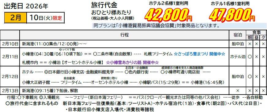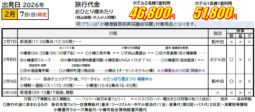 また、自由行動の時間には、冬の北海道人気イベント「小樽雪あかりの路」「さっぽろ雪まつり」をお楽しみいただけます。この機会にぜひ冬ならではの北海道へ遊びにいきませんか。