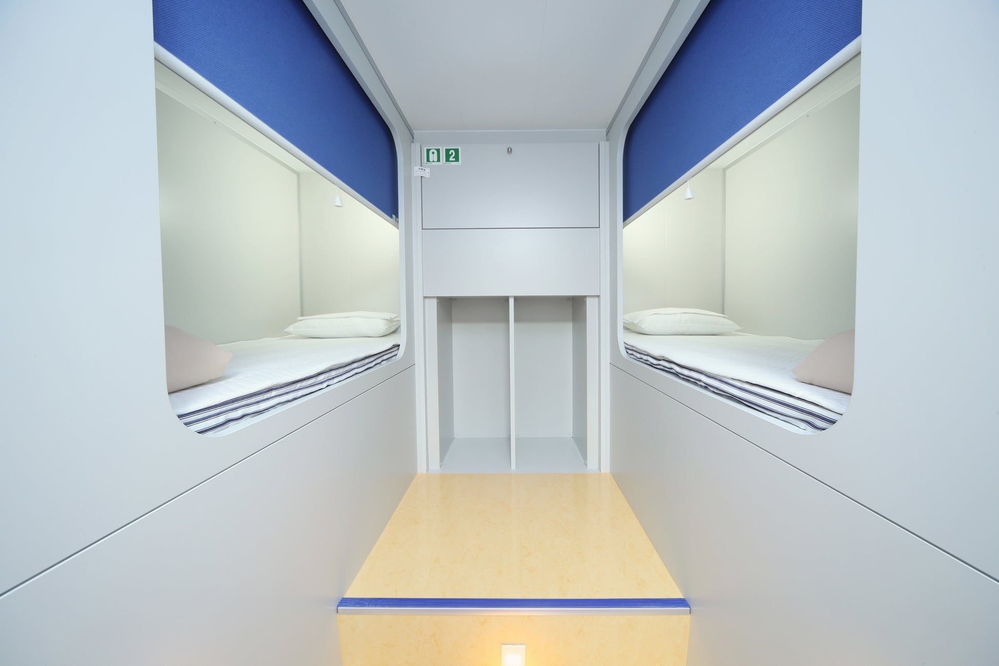 お一人様1ベッド。下段と上段が互い違いの入口になっているため、プライベート空間も確保