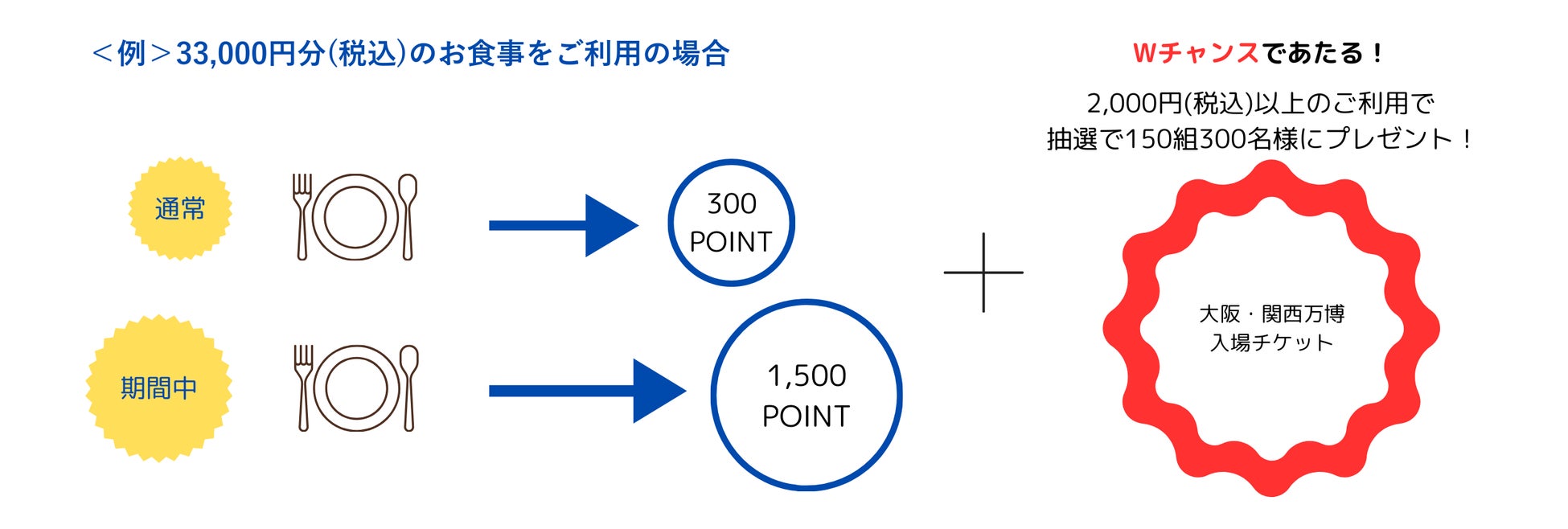 ・Wチャンスとして、2,000円(消費税・サービス料込)以上ご利用いただいた方の中から抽選で150組300名様に、大阪・関西万博ペア入場チケットをプレゼント。