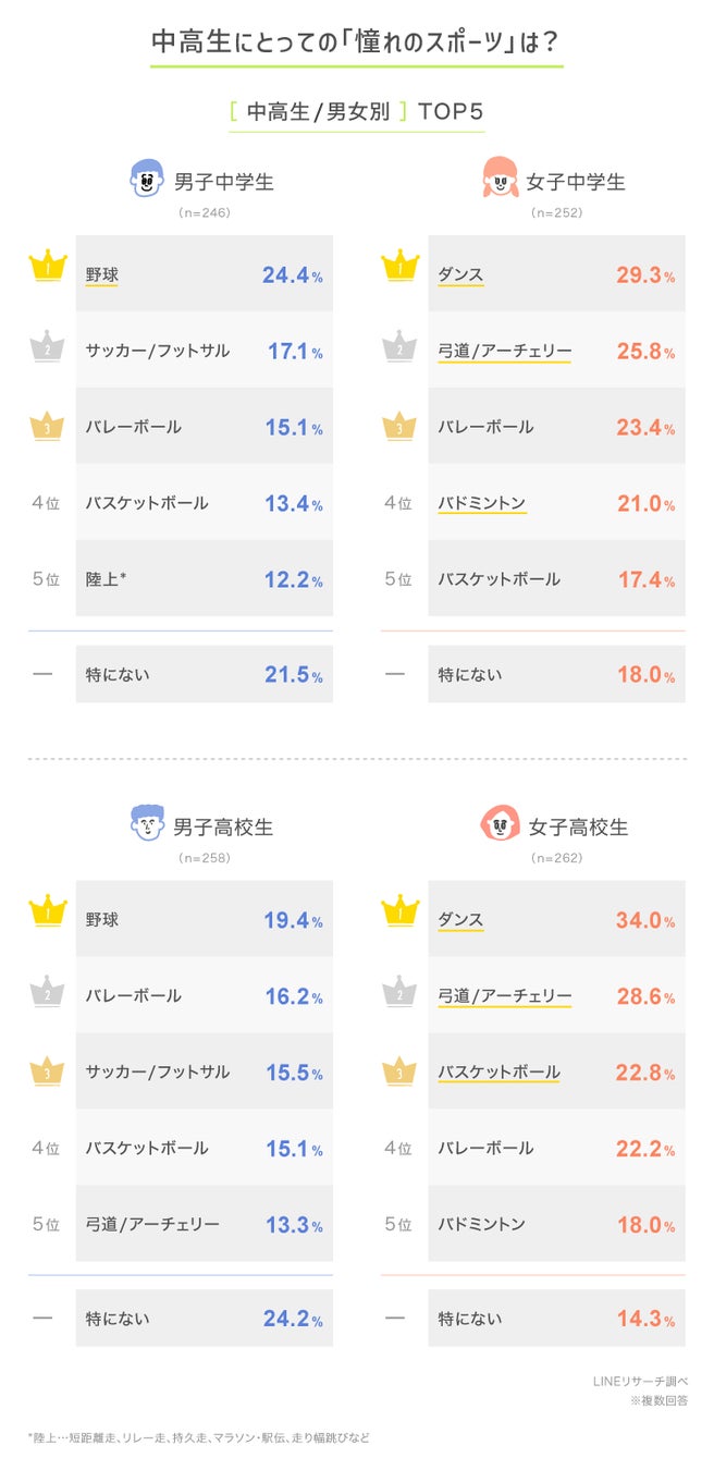 ■憧れのスポーツは?男子中高生は「野球」が1位、女子中高生では「ダンス」が1位