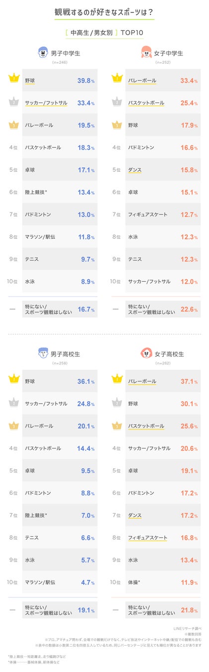 【LINEリサーチ】観戦するのが好きなスポーツ、男子中高生は「野球」、女子中高生は「バレーボール」が1位