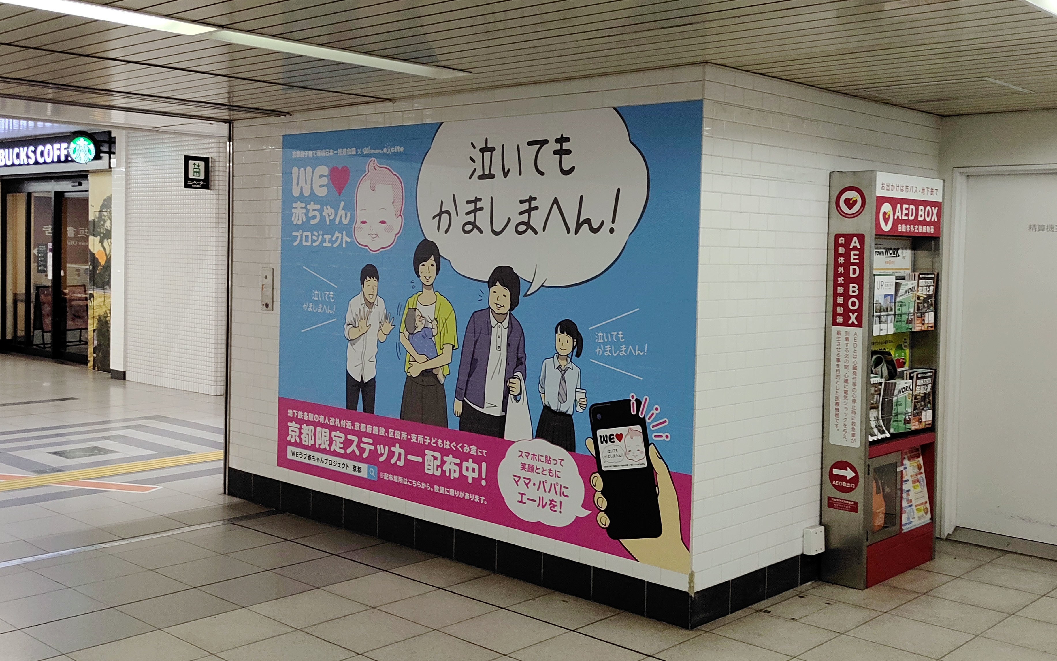 また、「泣いてもかましまへん!」ステッカーも、JR西日本の無人駅除く府内全43駅、京都市営地下鉄の全31駅、各地の公共施設など、身近な配布場所が順次拡大中。「電車やバスなど公共の場で赤ちゃんが泣いてしまったら…」と不安に思うママ・パパたちを温かく見守る取り組みが展開されています。