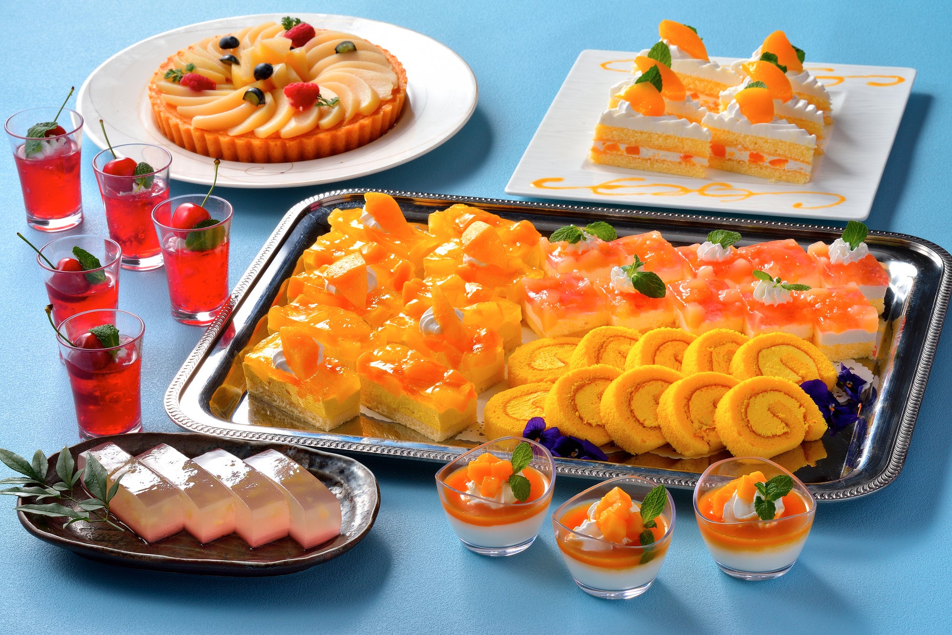 マンゴーロールケーキ、桃のミニパフェ、桃のタルト、白桃寒天、わらび餅など
