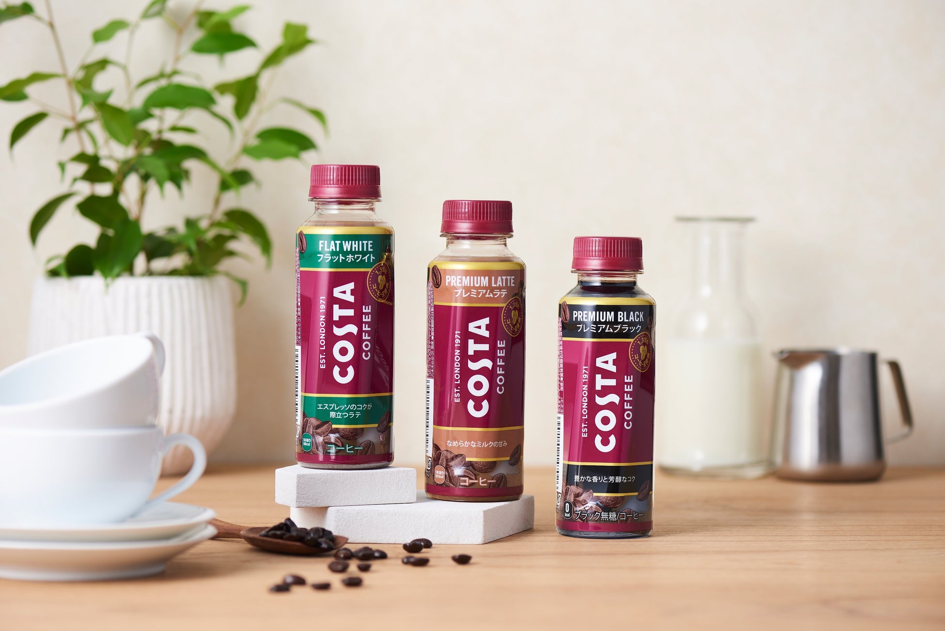 今回新しく発売されるフレーバーは、「コスタコーヒー フラットホワイト」「コスタコーヒー プレミアムラテ」「コスタコーヒー プレミアムブラック」の3製品となり、それぞれ厳選された高級豆を使用することで、カフェクオリティを追求した贅沢な味わいに仕上げました。