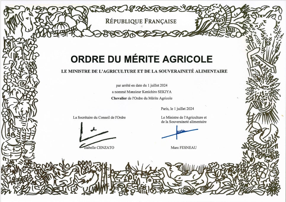 2024年7月1日に『フランス農事功労章 シュヴァリエ』受章が発表されました。