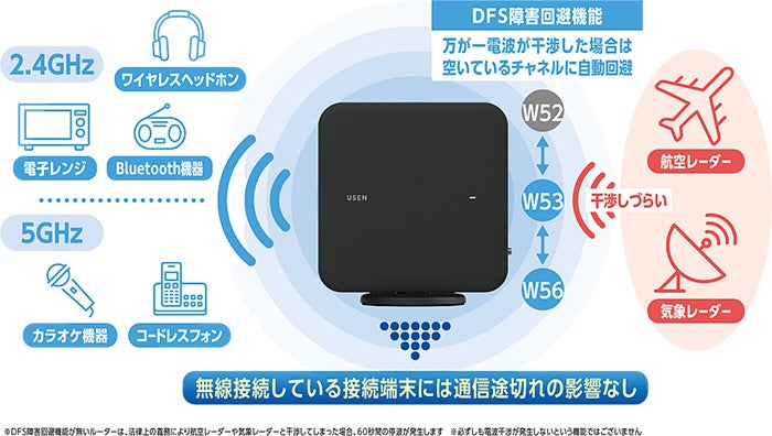 ※上記機能が無いルーターは、法律上の義務により航空レーダーや気象レーダーと干渉してしまった際に60秒間の停波が発生