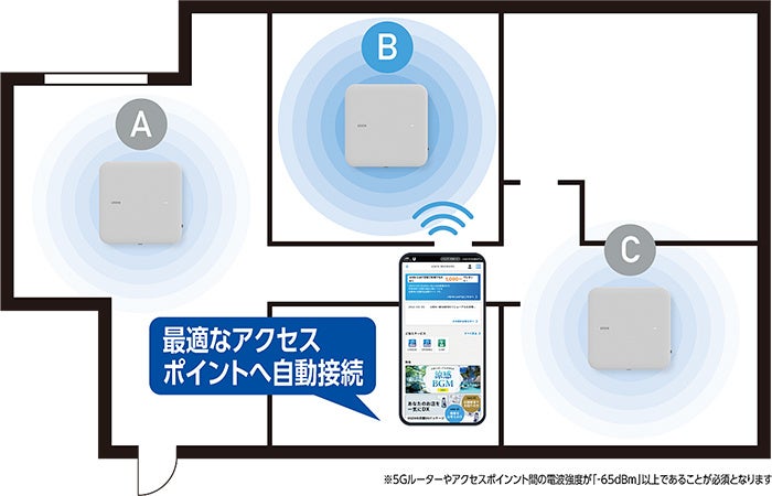 *メッシュ Wi-Fi:サブのアクセスポイントを空間内に複数設置し、網目状に電波を張り巡らせること