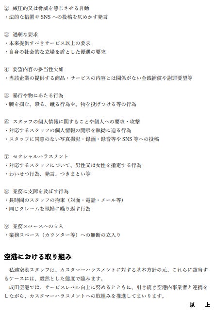 成田空港 CS 協議会※1 では、ご利用されるお客様及び空港スタッフの安全を確保す ることで、安心して空港をご利用いただけるよう「成田空港におけるカスタマーハラスメントに 対する基本方針」を策定致しました。 成田空港 CS 協議会では、引き続きお客様満足度の向上を目指して様々な施策※2 に取組むと共に、空港内事業者との連携をしながら、カスタマーハラスメントへの取組みを 推進してまいります。 なお、「成田空港におけるカスタマーハラスメントに対する基本方針」は、状況を勘案し、 必要がある場合には、随時見直して参ります。