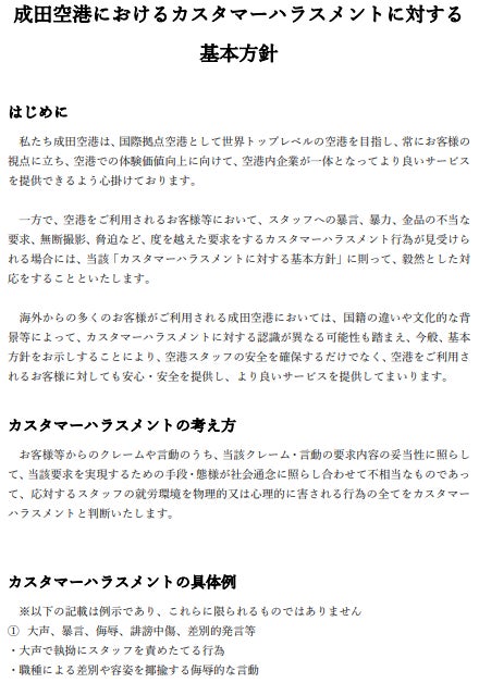 「成田空港におけるカスタマーハラスメントに対する基本方針」の策定