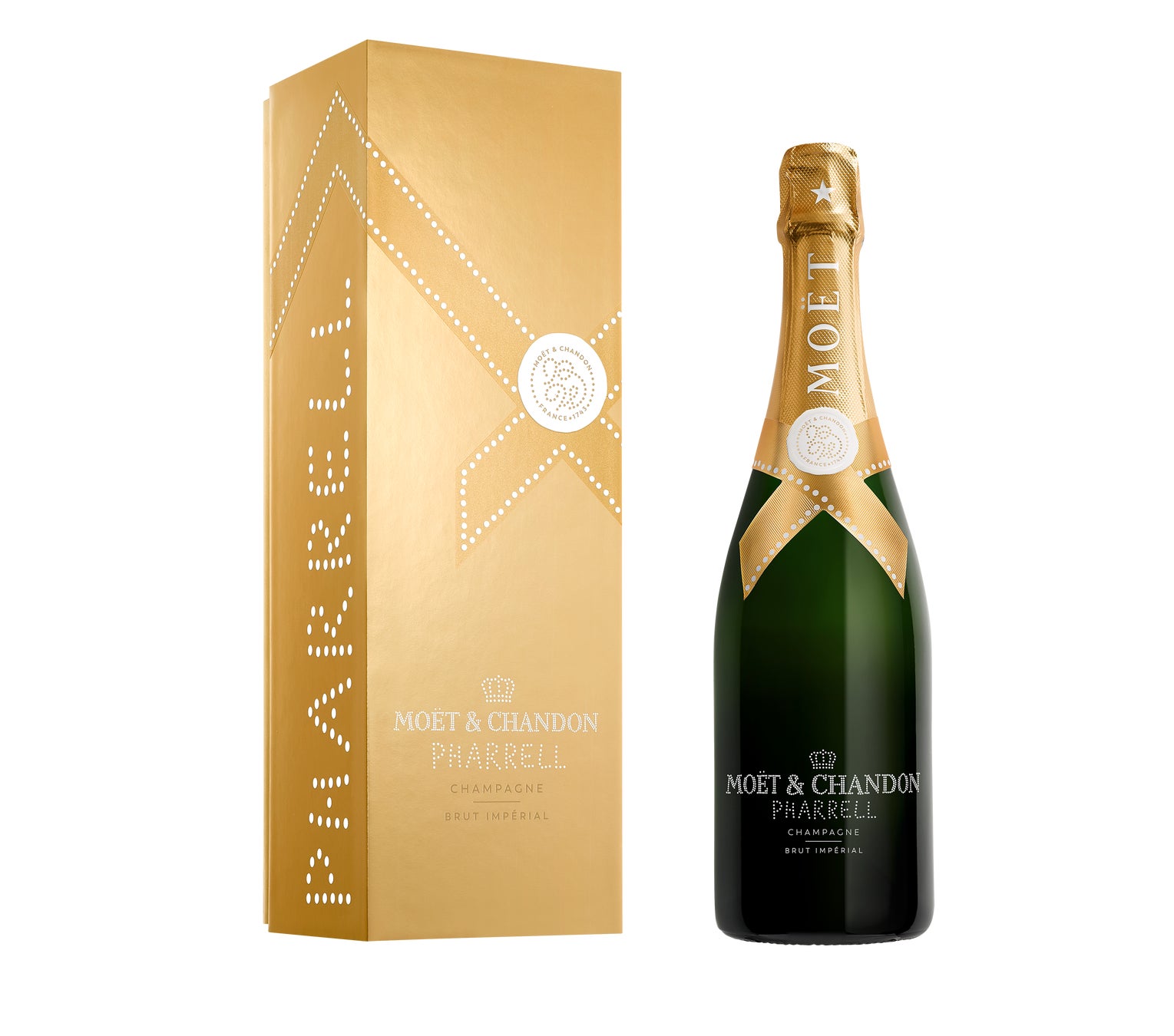 モエ・エ・シャンドンを代表するシャンパン「モエ アンペリアル」のボトルとボックスを、ミッドナイトブルー、ディープレッド、ゴールドの3種類でファレル・ウィリアムスがデザイン。パールを連想させる白いドットで、ボックスの側面にはファレル・ウィリアムスの名前が、ボトルのロイヤルシール部分にはイニシャルがデザインされています。
