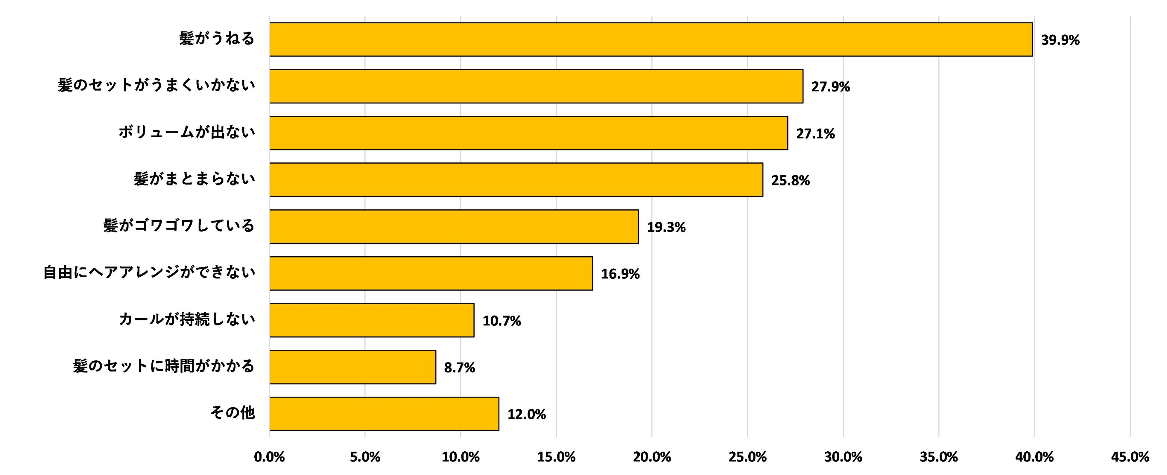 自身の髪質やくせについて悩んでいることを尋ねたところ、「髪がうねる」が39.9%でトップとなりました。次いで「髪のセットがうまくいかない」(27.9%)、「ボリュームが出ない」(27.1%)、「髪がまとまらない」(25.8%)が続きました。