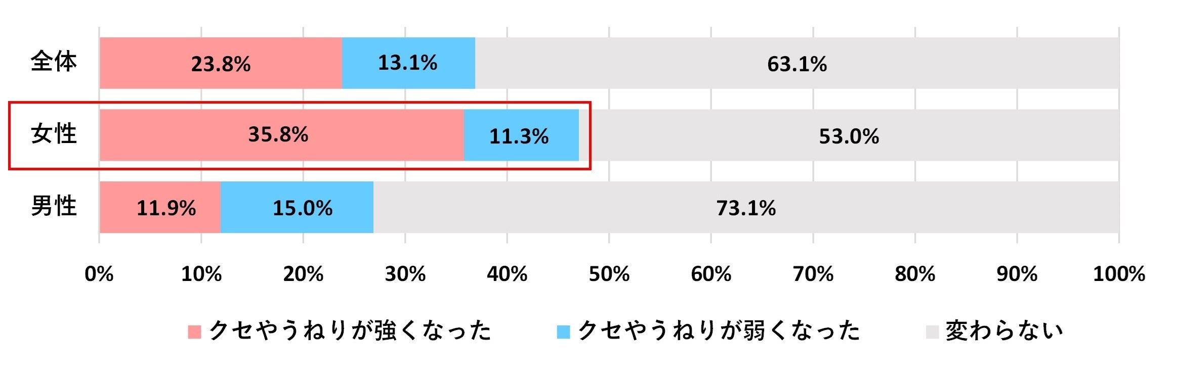年齢の変化に伴うくせや髪質の変化について尋ねたところ、「強くなった」もしくは「弱くなった」と回答した方は、全体で36.9%に上りました。特に「強くなった」と感じている方の割合が高く、女性では35.8%の方が「クセやうねりが強くなった」と回答しています。