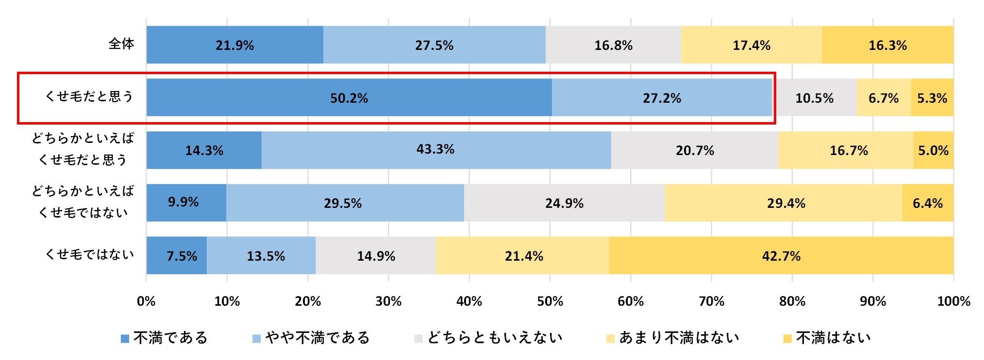 自身の髪質やくせについて不満があるか尋ねたところ、全体では合計で49.4%の方が「不満である」「やや不満である」と回答しました。この結果を前問の回答別に比較したところ、「くせ毛だと思う」と回答した方のうち、77.4%は自身の髪質に不満を感じていることが分かりました。一方、「くせ毛ではない」と答えた方は不満を感じている割合が低く、くせ毛かどうかが、髪への不満に大きく影響していることが分かります。