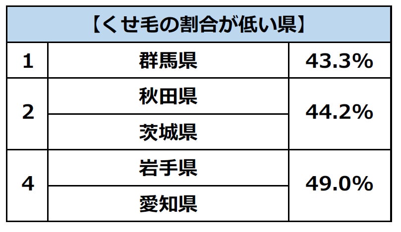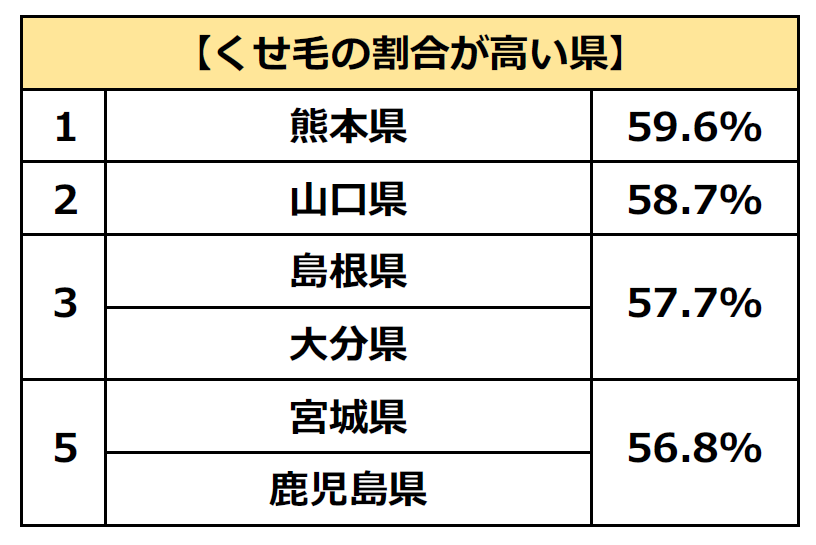 また、上記の質問に関して47都道府県別に見てみると、「くせ毛だと思う」「どちらかといえばくせ毛だと思う」と答えた方の割合が最も高かったのは「熊本県」で59.6%という結果になりました。次いで「山口県」(58.7%)、「島根県」「大分県」(57.7%)が続いています。5位以上を見ると中国地方と九州地方の県が多くランクインする結果となりました。一方、最も低かったのは「群馬県」(43.3%)となり、トップの熊本県と比較すると、15%以上も差が開いています。