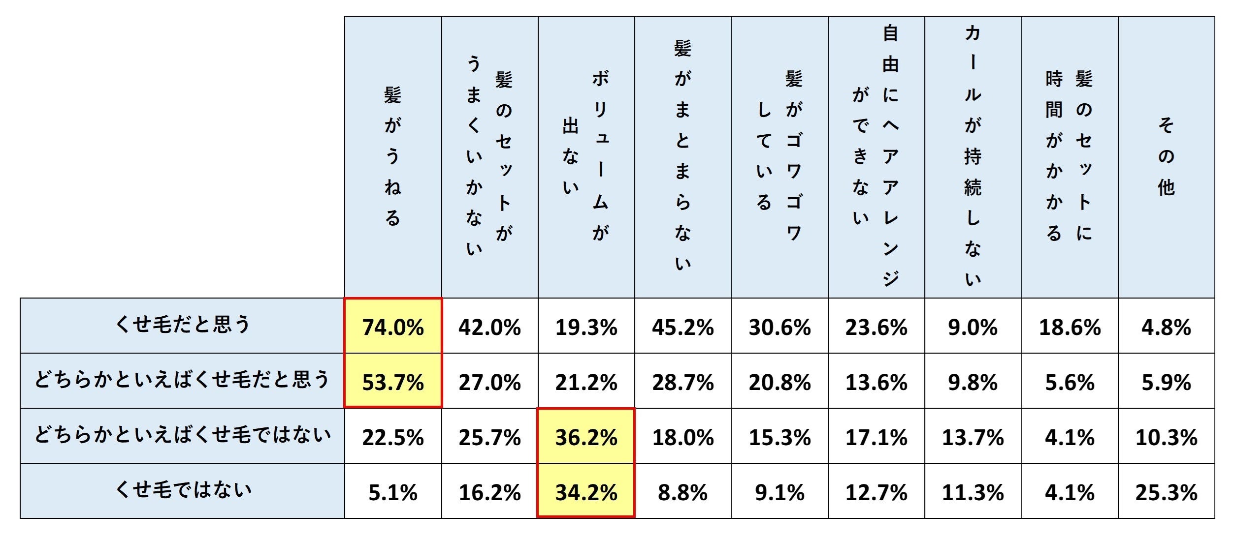 一方で、「くせ毛ではない」と回答した方では、「ボリュームが出ない」ことにお悩みの方が多い結果となり、くせ毛の度合いによっても、髪の悩みが異なることが分かりました。