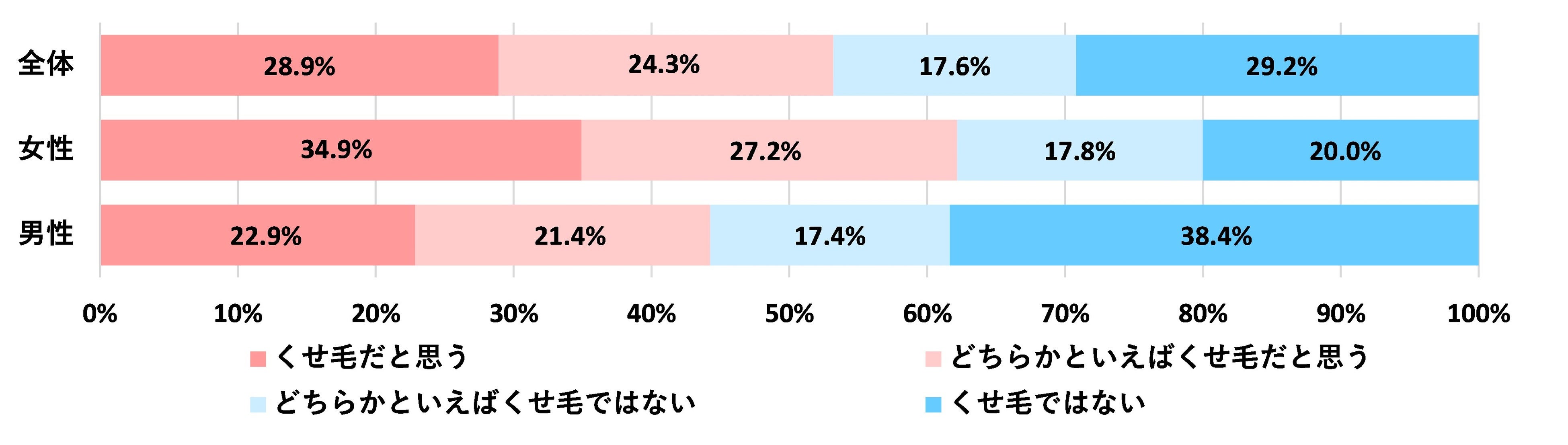 自身をくせ毛だと思うか尋ねたところ、「くせ毛だと思う」「どちらかといえばくせ毛だと思う」と答えた方の合計は、全体で53.2%と約半数に上りました。男女別では女性の方がくせ毛を実感している割合が高く、62.1%と男性(44.3%)よりも17.8%高い結果となりました。