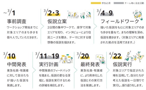 さらに、当社社員や有識者とのアイデアブラッシュアップ、生活者起点でのまちづくりを実践する機会を用意しています。これにより、アイデアを実行に移すまでの一連のスキルやノウハウを得ることが可能です。