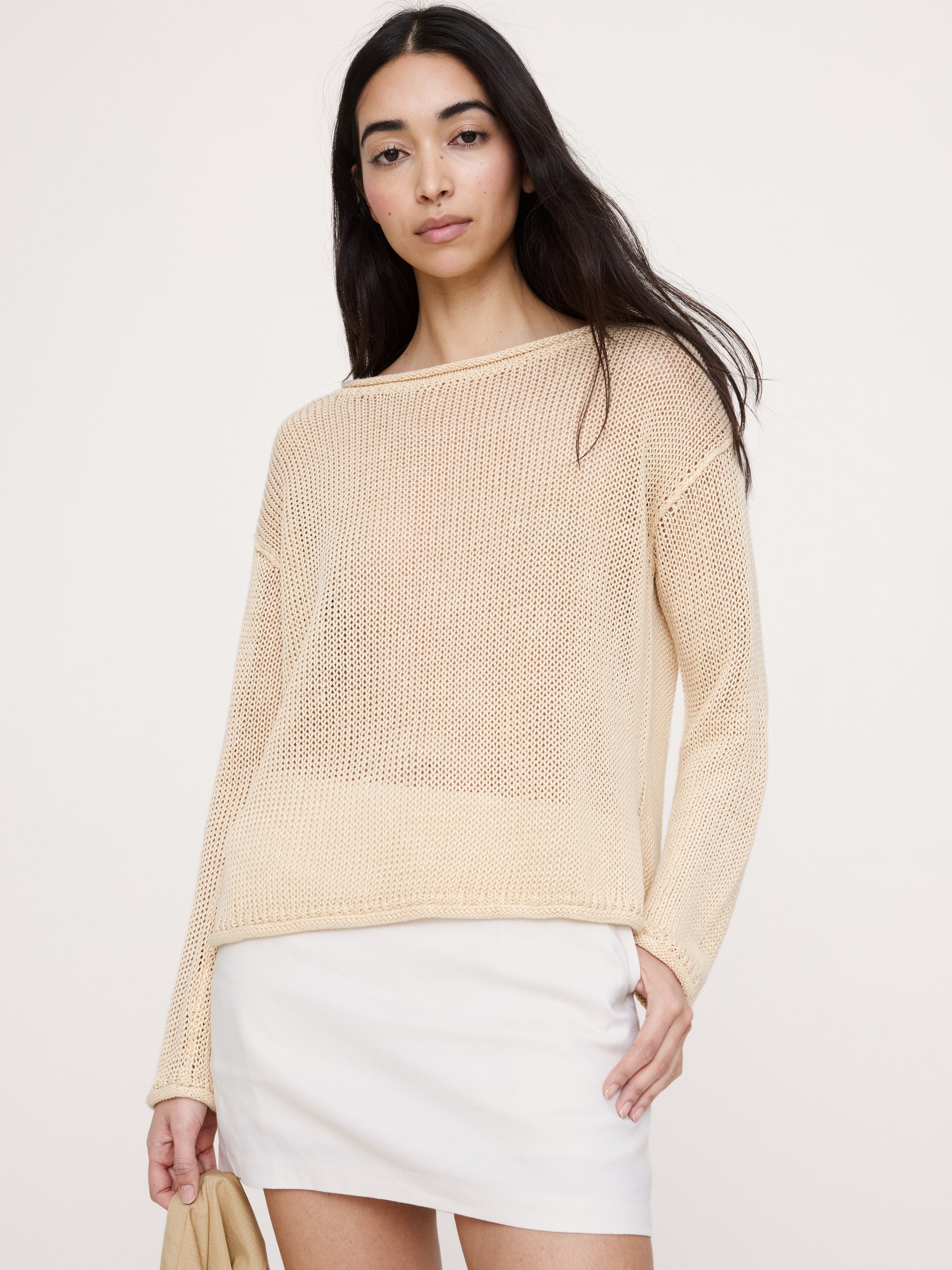 リネン Vネックセーター(22,000円)/ボートネック セーター(22,000円):しなやかで肌に馴染む上品な風合いが魅力のヨーロピアンリネンを採用。