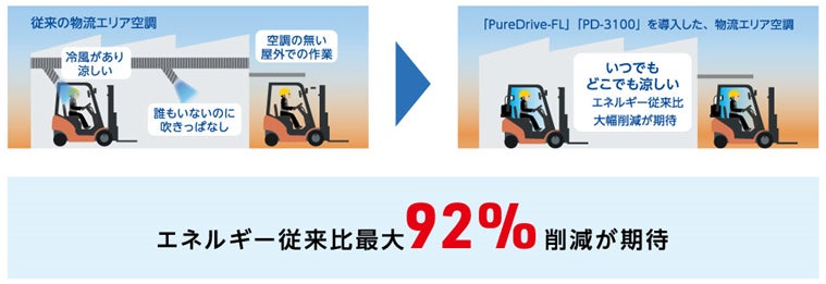 電動フォークリフトのバッテリーで8時間連続稼働させた場合のバッテリー消費割合はバッテリー容量の約2.2%(バッテリー容量48V/400Ahの場合)とわずか。また、PD-3100を導入する事でパーソナル空調化が実現するため、全体空調にした場合と比較してエネルギーの大幅な削減が期待できる試算結果が得られている。