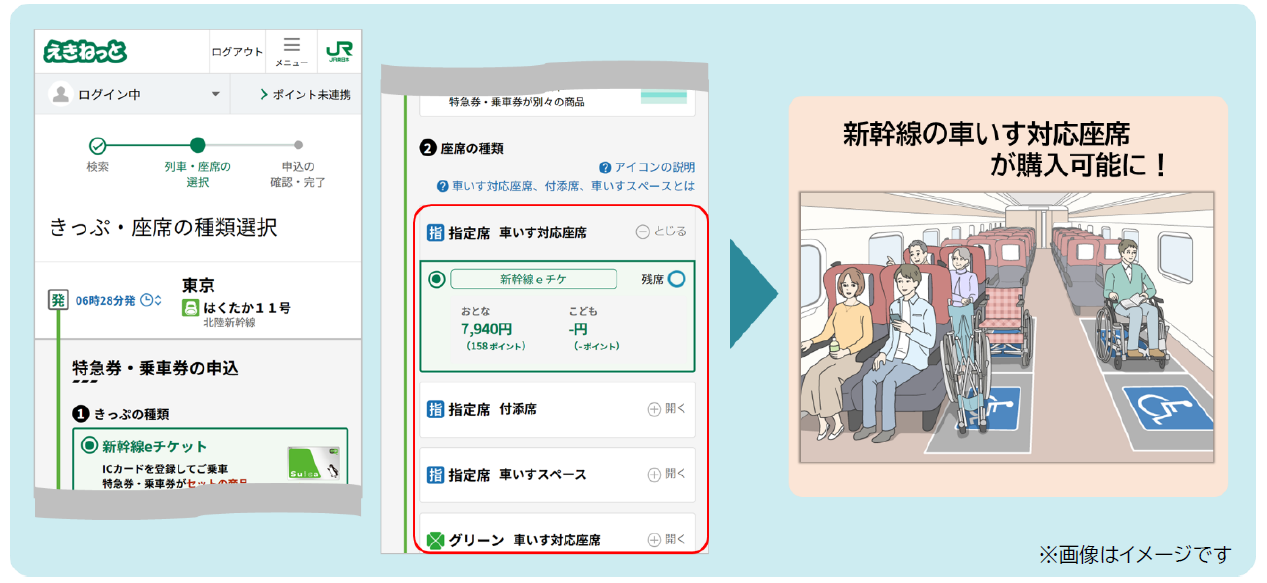 ・東北・秋田・山形・上越・北陸・北海道新幹線の車いす対応座席(本人席、付添席、車いすスペース)が購入できます。