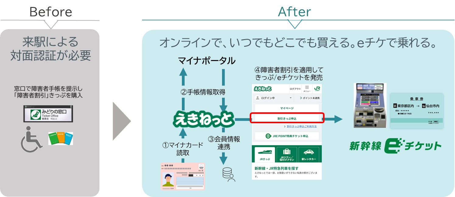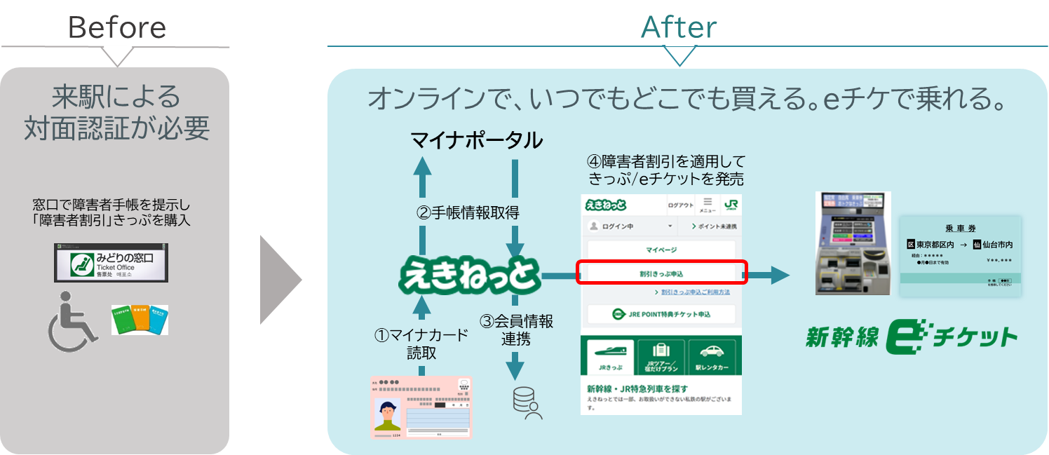 ・マイナポータルと連携することで、窓口に行かずに障害者割引きっぷが購入できます。