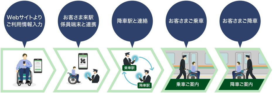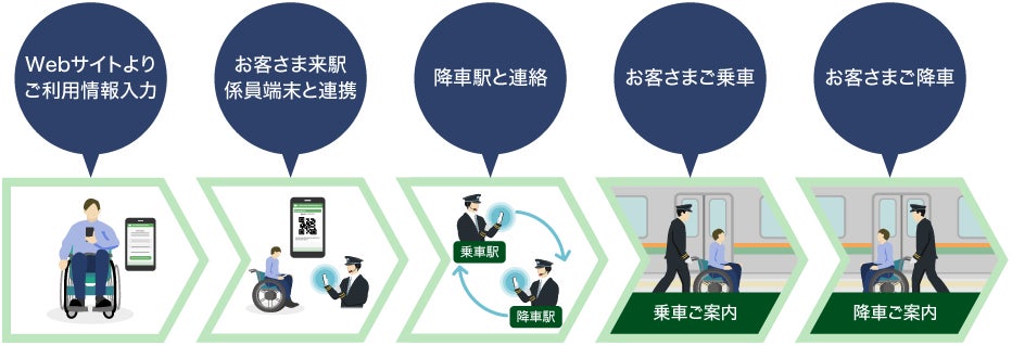 ・これまでは乗降するときの介助を事前に駅窓口等で受付けている駅もありましたが、サービス導入線区においてはご出発の2日前の午前12時までは駅に行かずWebからお申し込みいただけるようになります。
