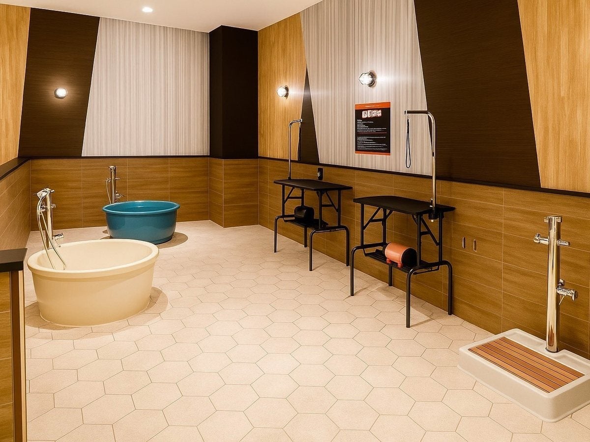 広さ約170㎡のドッグランエリア、ペット用温浴槽、セルフドライヤーコーナー |