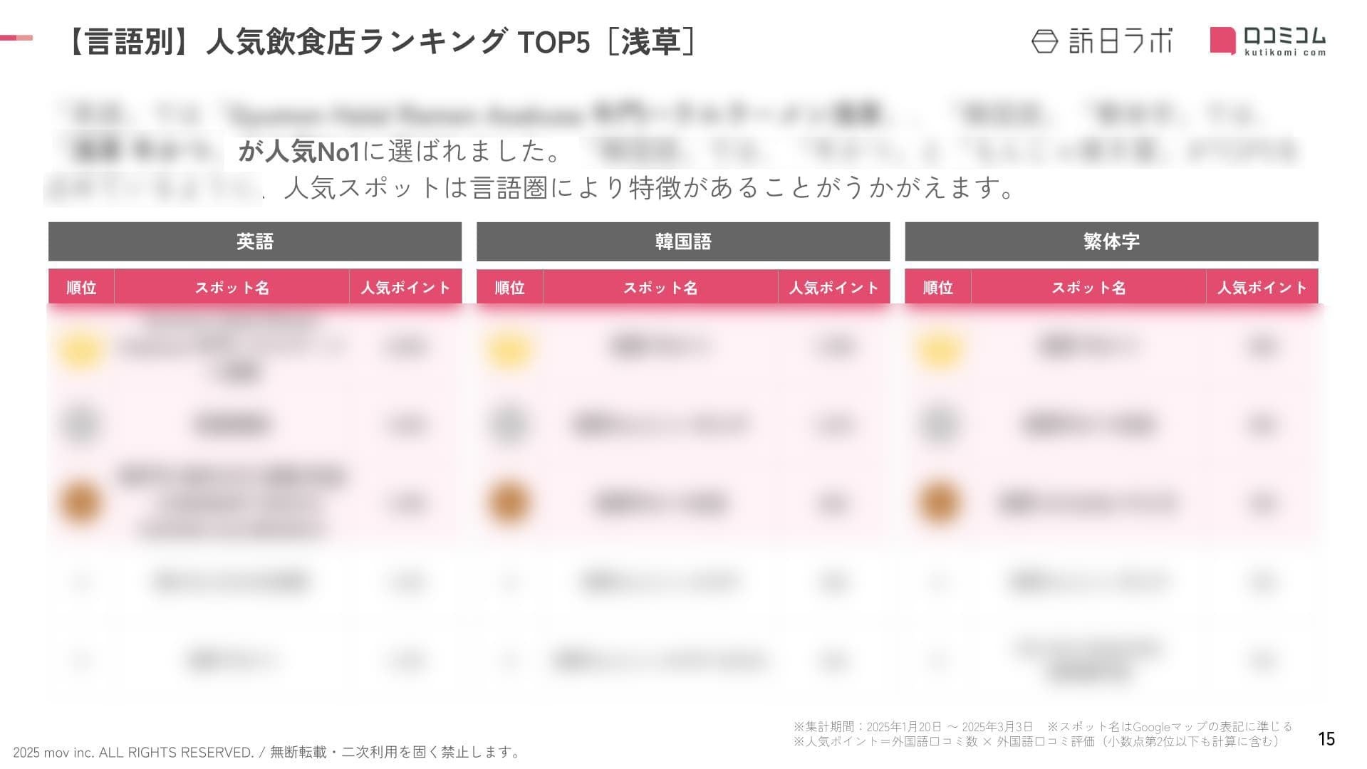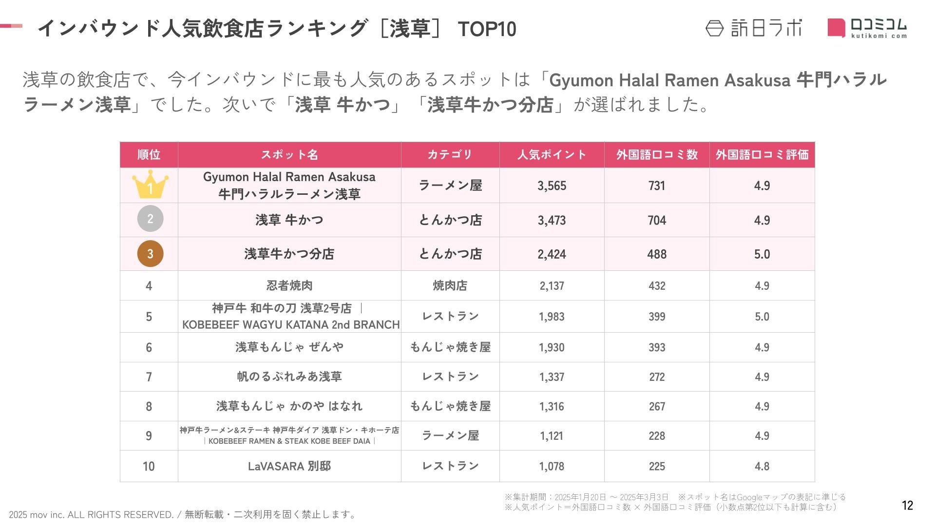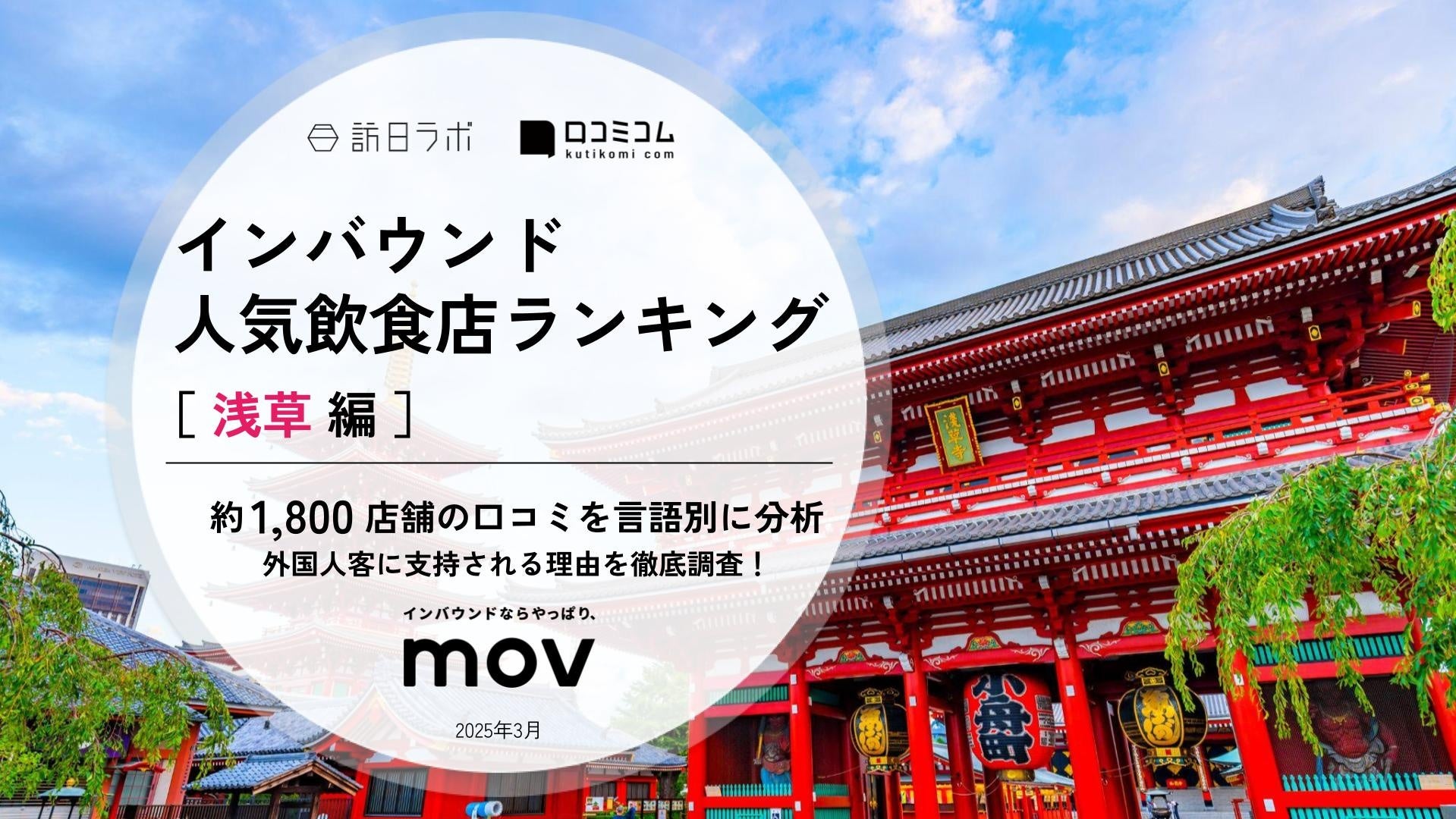 業界最大級のインバウンドビジネスメディア「訪日ラボ」及び 店舗向け集客一元化プラットフォーム「口コミコム」を運営する株式会社mov(代表取締役:渡邊 誠、本社:東京都渋谷区、以下mov)は、浅草エリアの飲食店に寄せられた最新の口コミデータから、独自の『インバウンド人気観光地ランキング』を発表しました。