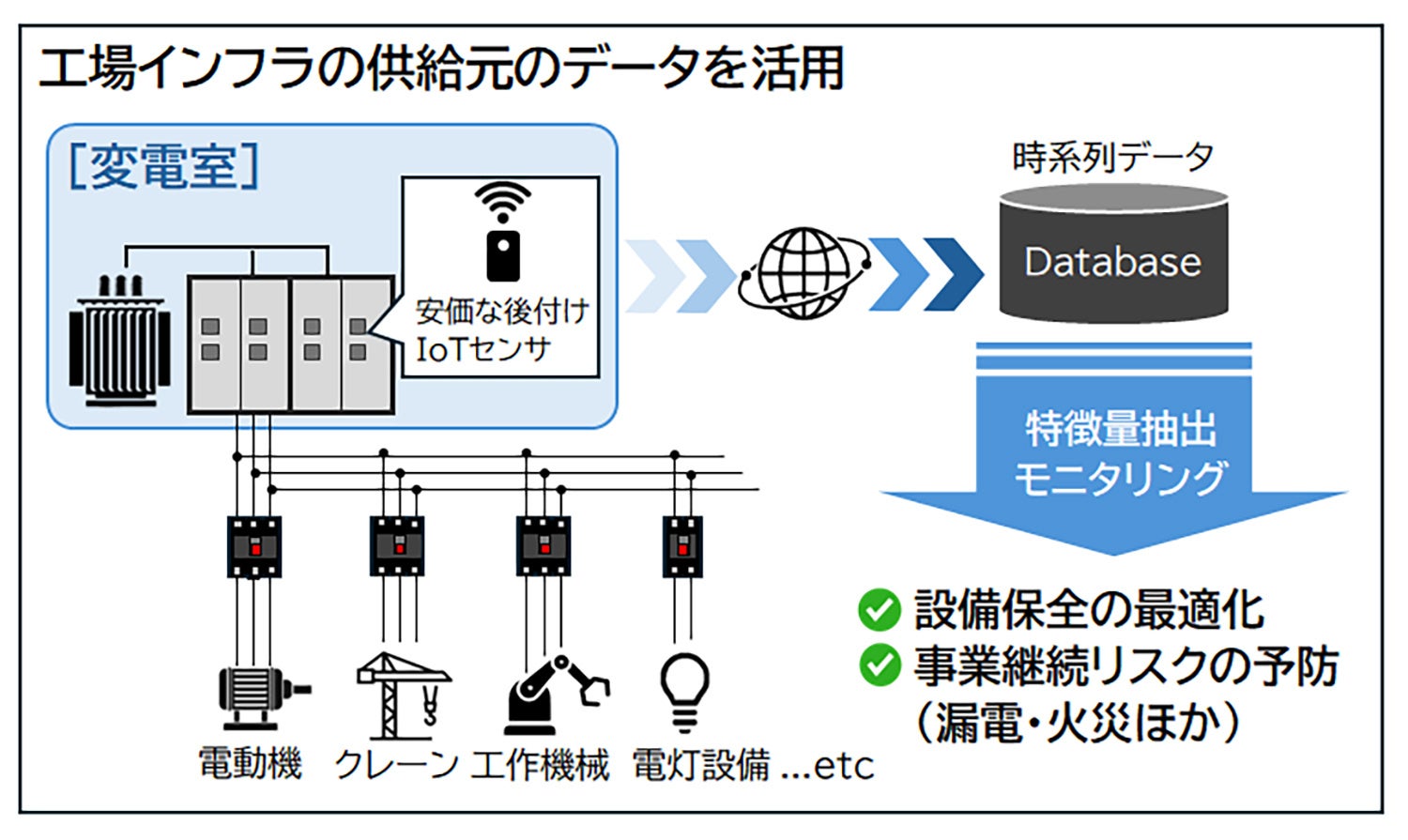 人の経験やスキルに依存しやすい設備保全業務をデジタル技術で高度化する活動。具体的には、設備への後付けが容易なIoTセンサーや大量のデータから特徴量(データの特徴を数値化した情報)を抽出するデータクレンジングなどのデジタル技術を活用して、社内の工場のインフラ保全業務を合理化・効率化する。対象としたのは、末端電気系統が約2万2,000系統ある広島製作所観音工場で、電気系統の最上流にある変電室にIoTセンサーを取り付け、工場全体をモニタリングする仕組みを構築した。従来、2万2,000か所の末端設備の巡視点検・検針業務を人手で行っていたが、350か所の変電室のデータのみで自動評価ができるようにして、点検工数を約60%減らす目途が付いた。漏電リスクの低減と個別設備の停電点検時間の削減によって、工場のダウンタイム発生も防ぐことができる。他工場への展開も可能。