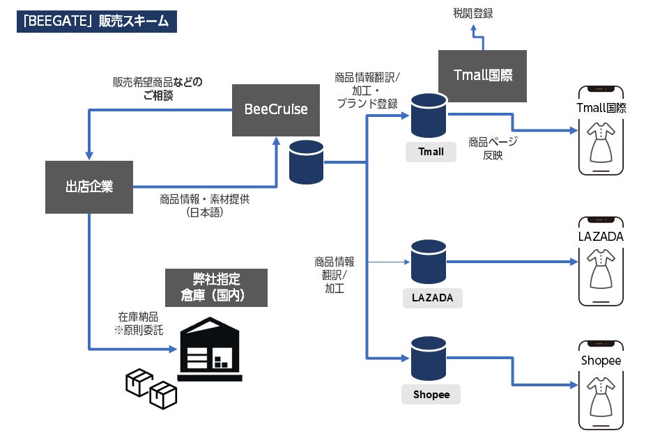 BEENOSグループで越境ECおよびジャパニーズコンテンツの海外進出をサポートするBeeCruise株式会社(以下「BeeCruise」)は、海外の店舗に日本への商品卸しのみで委託販売ができるサービス「BEEGATE(ビーゲート)」の提供を開始します。導入企業は日本国内取引とほぼ変わらないフローで、中国・欧米・東南アジアで主要なECモールである「天猫国際」「Shopee」「LAZADA」等にある店舗への同時出品が可能となることに加え、BeeCruiseの海外実店舗ネットワークを活用し、現地需要に応じた商品提案や商談対応といったサポートが可能となります。