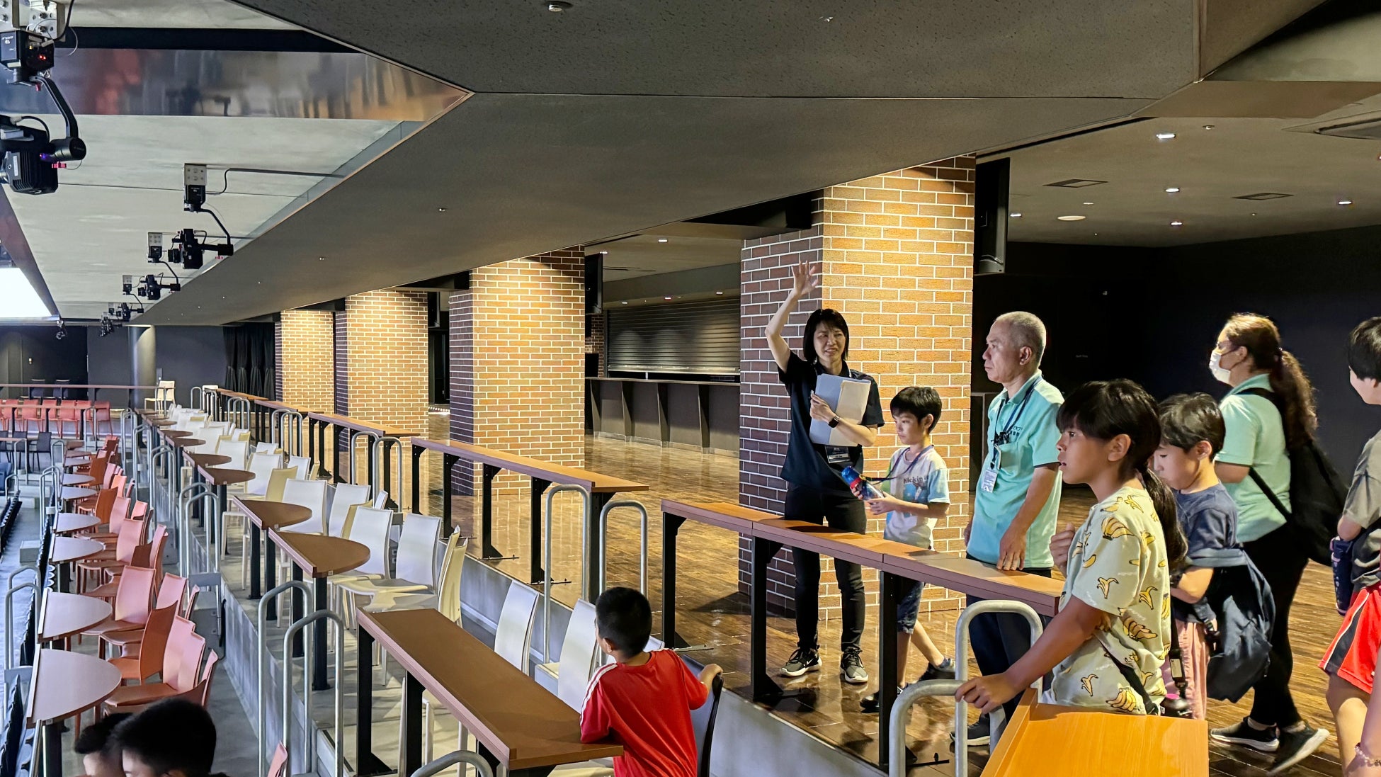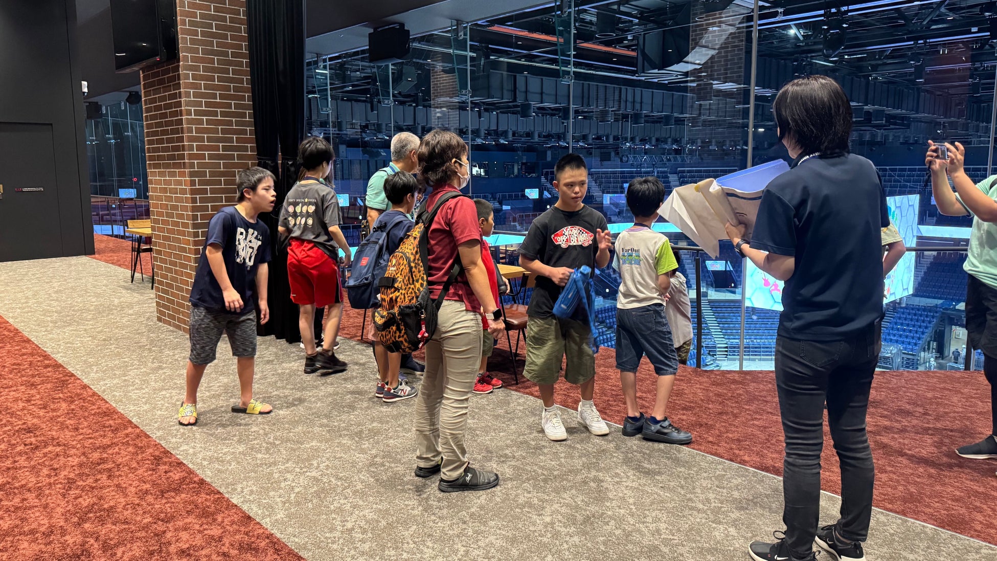 沖縄アリーナ株式会社の協力のもと、最上階5階のパノラマラウンジから見下ろす沖縄アリーナのフロアやスイートルームの見学、2階コンコースのキッズコンテンツ体験など、アリーナ内の雰囲気を楽しんでいただきました。また、見学中にゴーディーがサプライズゲストとして登場し、子どもたちとハイタッチや一緒に写真を撮って交流しました。