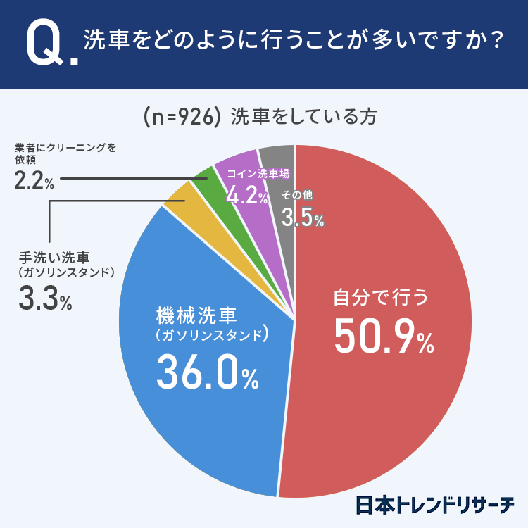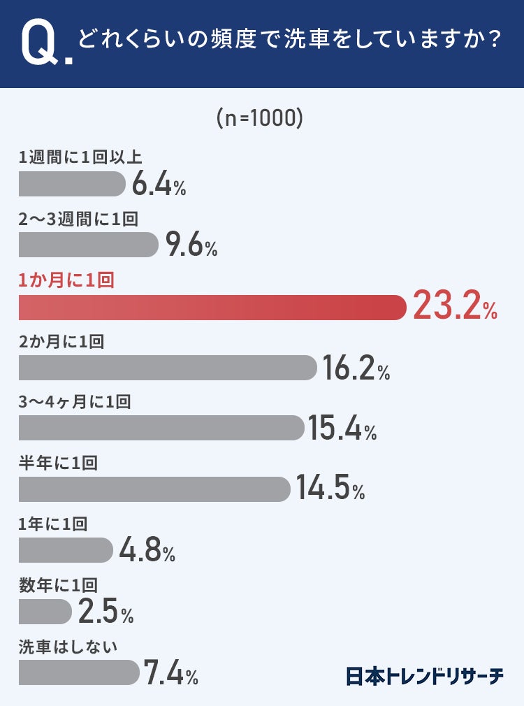 現在車を所持している23.2%が「1か月に1回」で、50.9%が「自分で洗車している」と答えました。