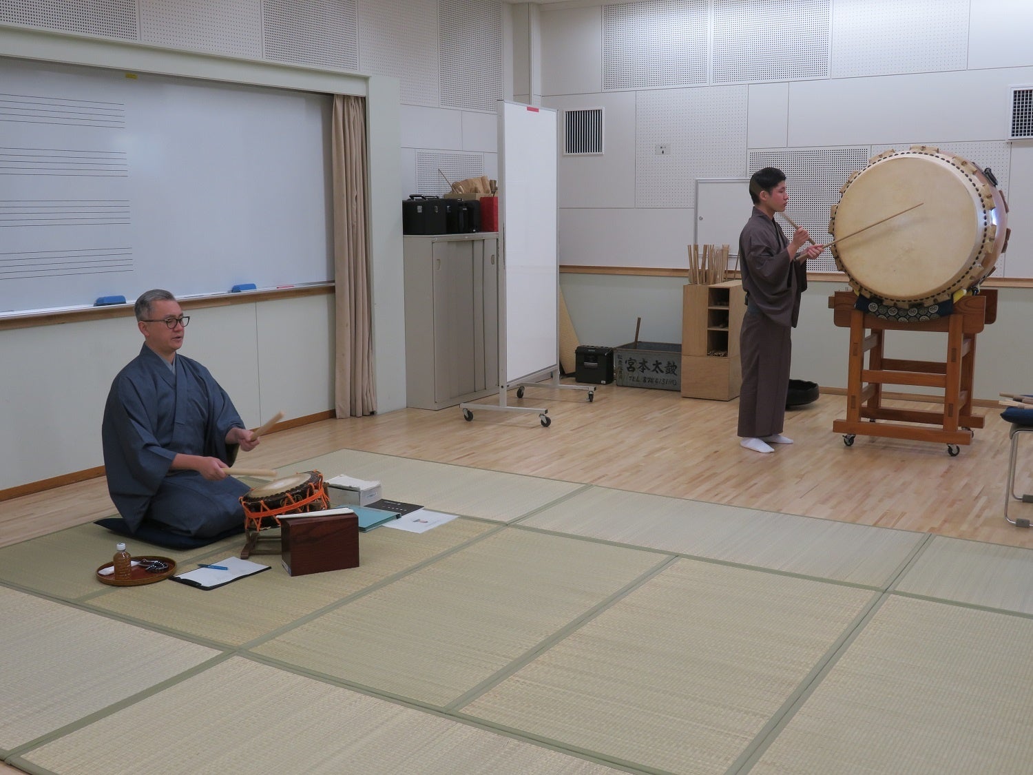 研修課程では、小鼓・大鼓・太鼓・大太鼓・笛の演奏法を学び、鳴物演奏者に必要な技芸や知識を習得します。