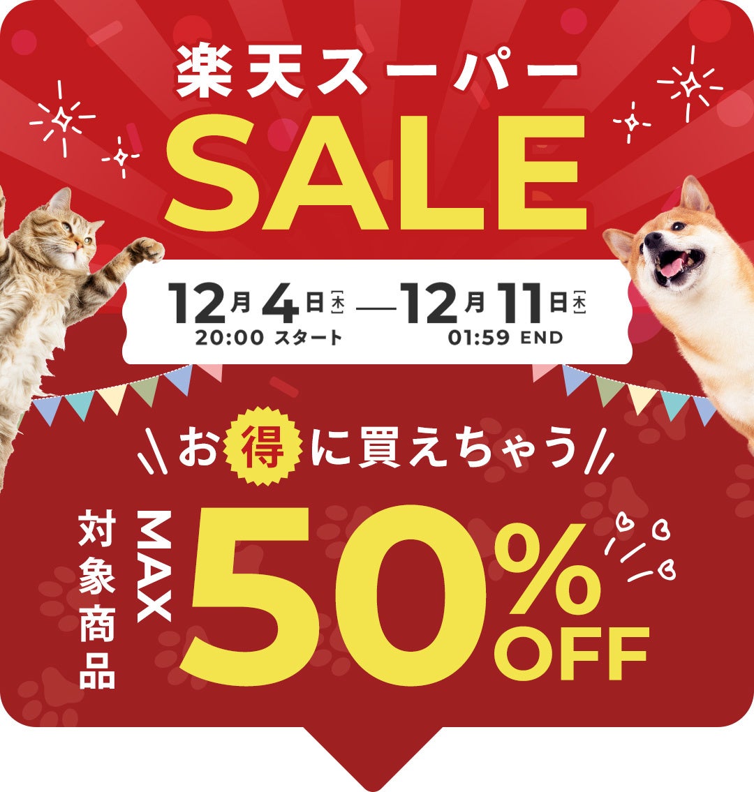 愛犬・愛猫との暮らしを快適にする人気アイテムが特別価格で登場。毎日のケア用品からおでかけグッズまで、最大50%OFFでお得にお買い求めいただけます。楽天スーパーセール限定のチャンスをご活用ください。