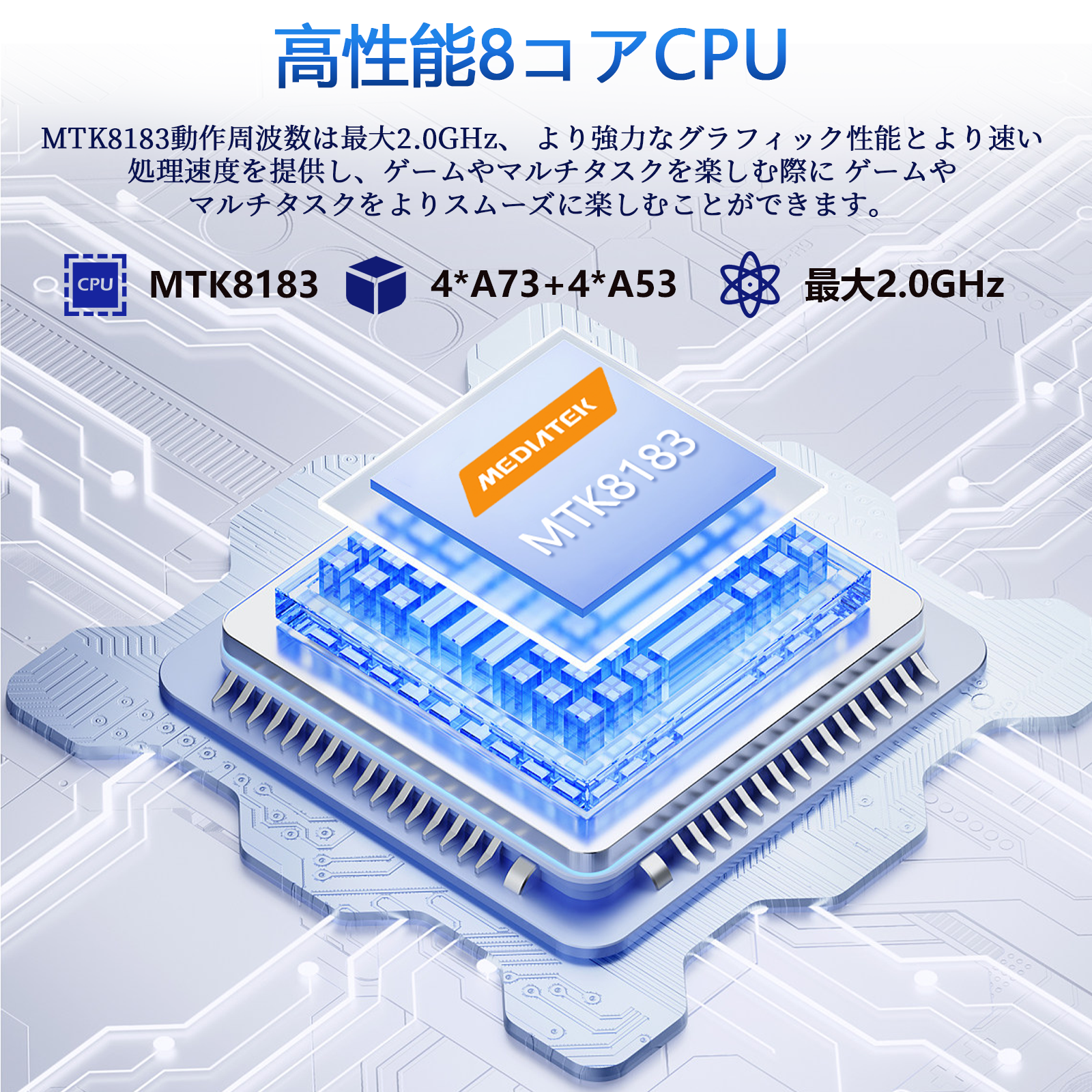 N-one Npad Q Android 13 タブレット には、最新のOSであるアンドロイド13を搭載し、GMS認証も取得しているため、グーグルプレイストアから人気のアプリをダウンロードできる。強力な SoC MediaTek MT8183、4*A73+4*A53 されたオクタコア, 2.0 GHz に達する 。消費電力が低くなり、タブレットPCのパフォーマンスが大幅に向上します。 Mali-G72 MP3グラフィックプロセッサ搭載、動作周波数800MHz。