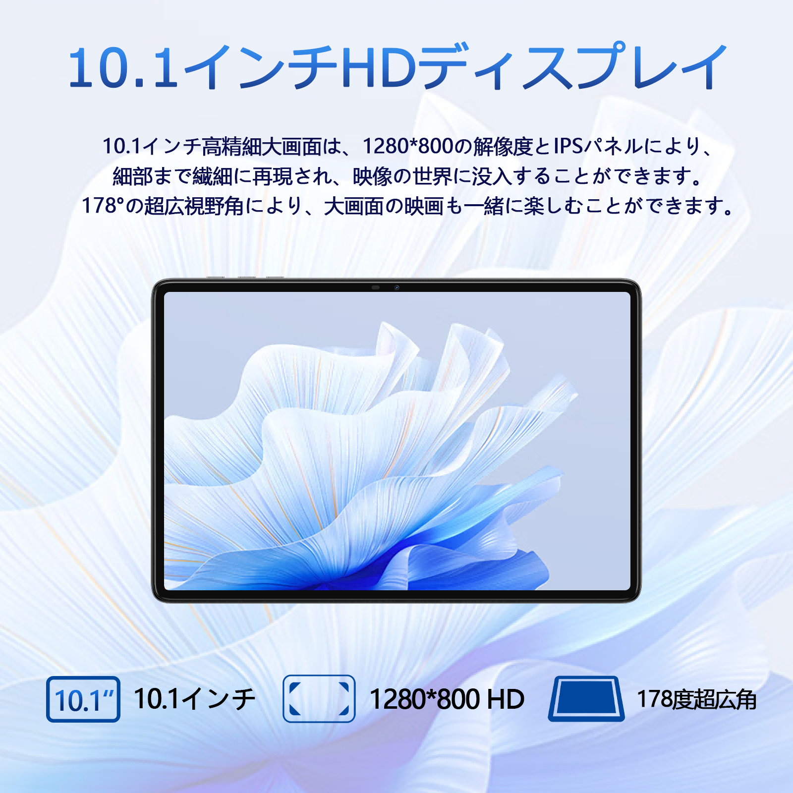 反応性の高いフラッシュを備えたリアの13MPオートフォーカスカメラは、暗い場所でも簡単に撮影できます。更新されたカラーアルゴリズムを備えた5MPのフロントカメラは、滑らかでクリアな顔の映像やビデオチャットを提供します。800x1280のIPS解像度を備えた10.1インチのディスプレイを搭載し、さらに広い画面領域を実現する新しいエッジ・トゥ・エッジ・ディスプレイを提供します。このAndroidタブレットは、色とクリアな画質の信じられないほどのボーダーレスな世界を提供します。