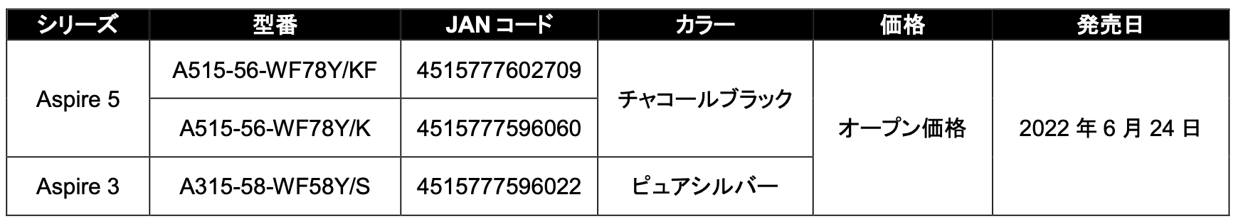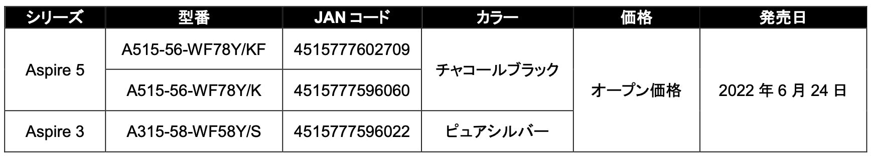 日本エイサー株式会社(本社:東京都新宿区、代表取締役社長:ボブ・セン)は、基本性能をおさえたスタンダードノートパソコン Aspire(アスパイア)シリーズより、新モデル3機種「A515-56-WF78Y/KF」「A515-56-WF78Y/K」「A315-58-WF58Y/S」を2022年6月24日(金)より発売開始します。3機種すべて15.6インチのフルHDディスプレイを搭載。「A515-56-WF78Y/KF」「A515-56-WF78Y/K」は第11世代インテル(R) Core(TM) i7プロセッサーを、「A315-58-WF58Y/S」は第11世代インテル(R) Core(TM) i5プロセッサーを搭載しています。パワフルなパフォーマンスを大画面で駆使できる本製品は、写真や映像の編集などクリエイティブな作業をする方や、高負荷な処理が必要な作業を快適に行えるノートPCをお探しの方にオススメです。