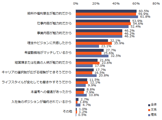 2:本選考エントリーの決め手、「理念やビジョンへのへの共感」は文系理系で12ポイントの差。(図3、4)